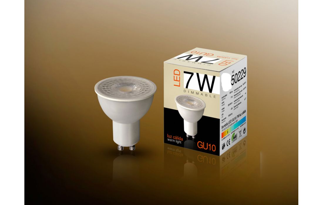 Lâmpada Spot dricroica LED REGULÁVEL de 7W. Luz cálida 3000K. 560 lúmens, equivalente a incandescente de 60W. Feixe de luz de 100°. Para casquilho GU10.