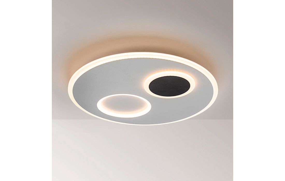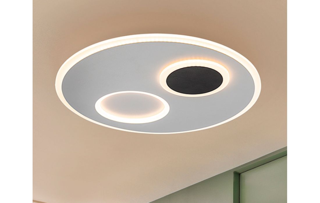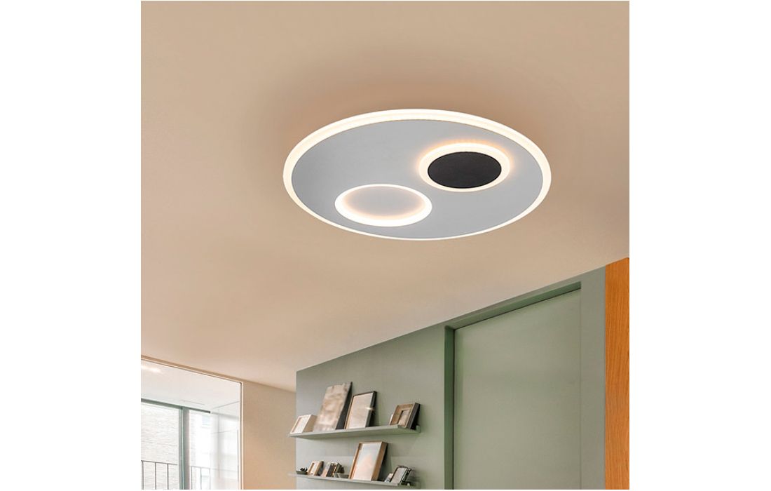 Candeeiro de teto feito em metal e alumínio, acabamento branco mate e preto. Difusor opalino acrílico.