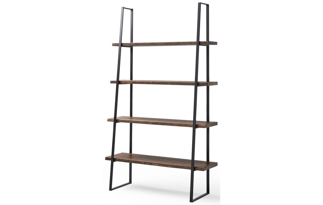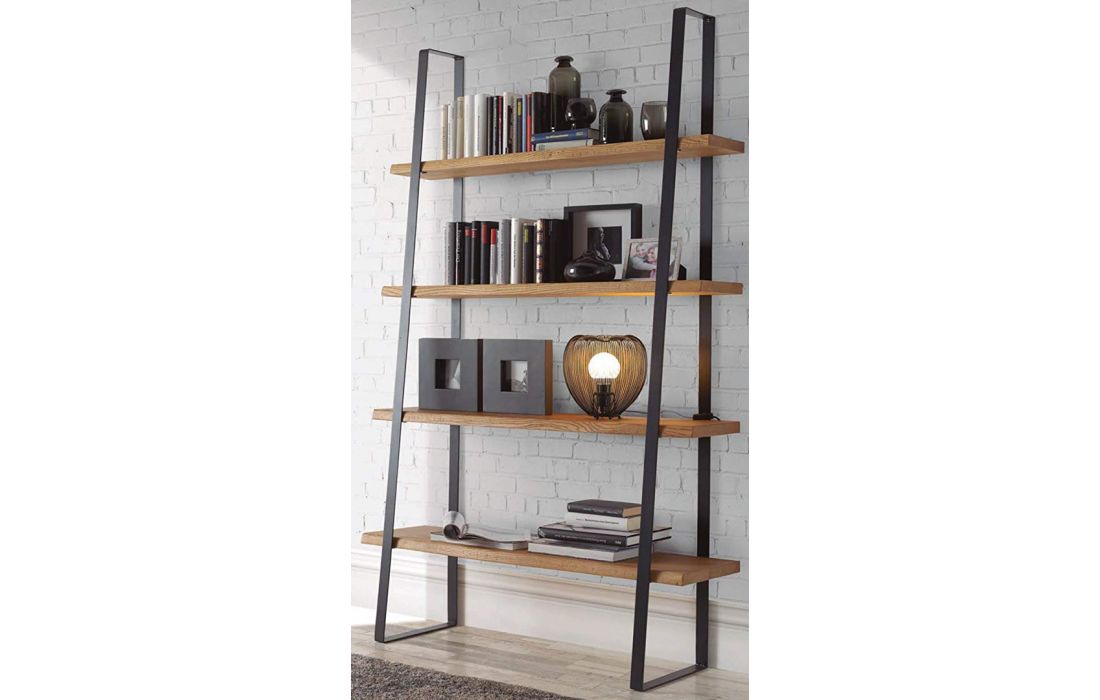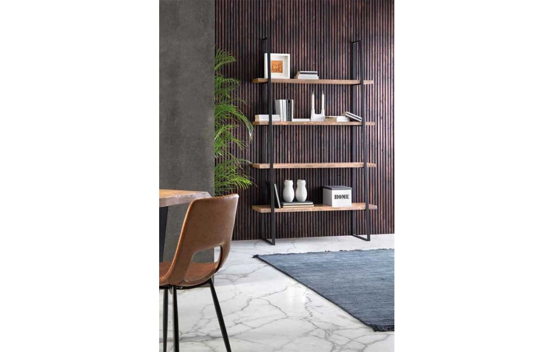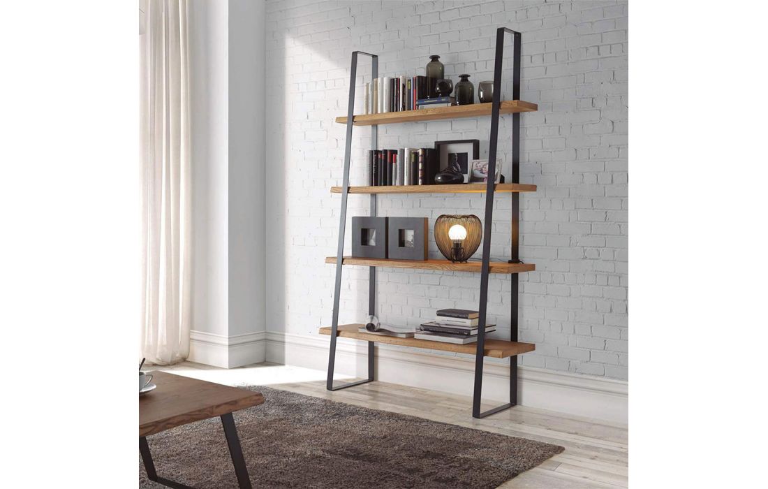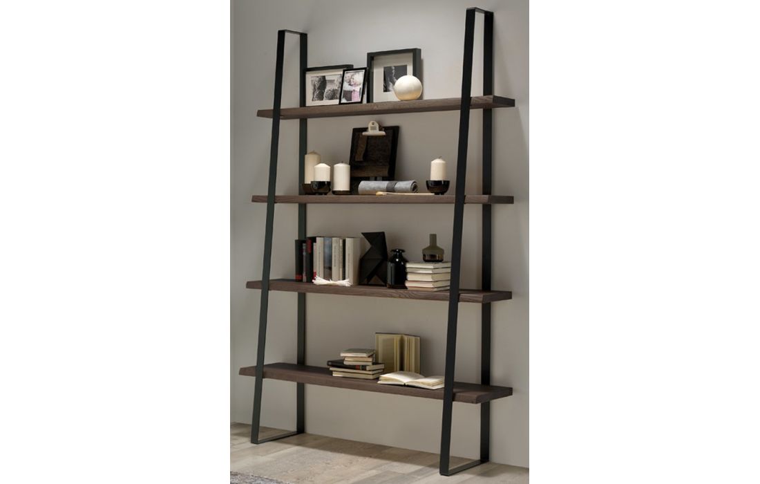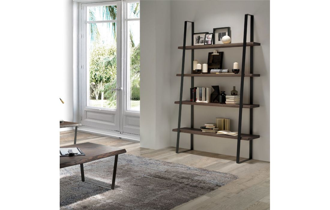 Estante em madeira maçica de freixo com 3 tipos de acabamento, estrutura em metal preto.