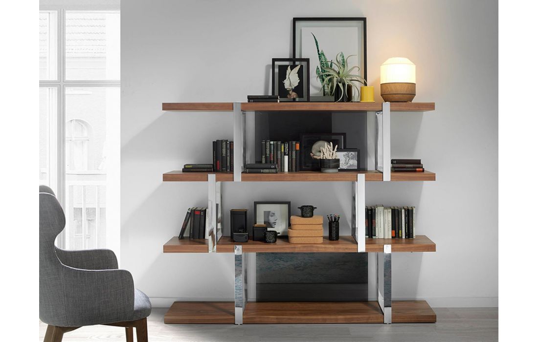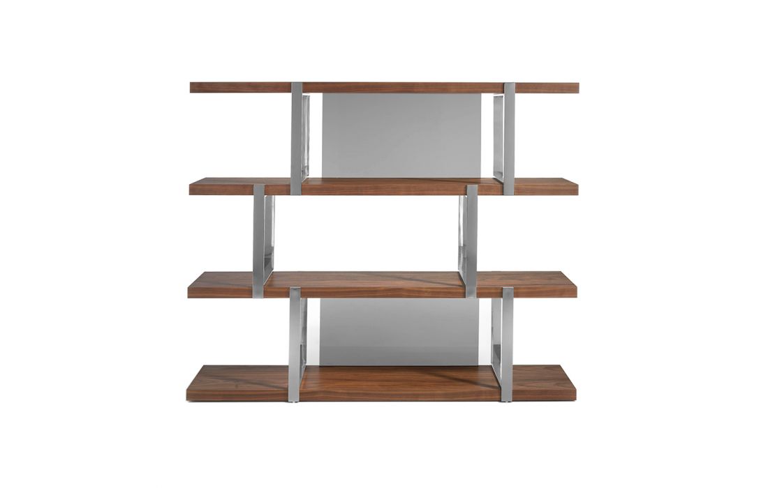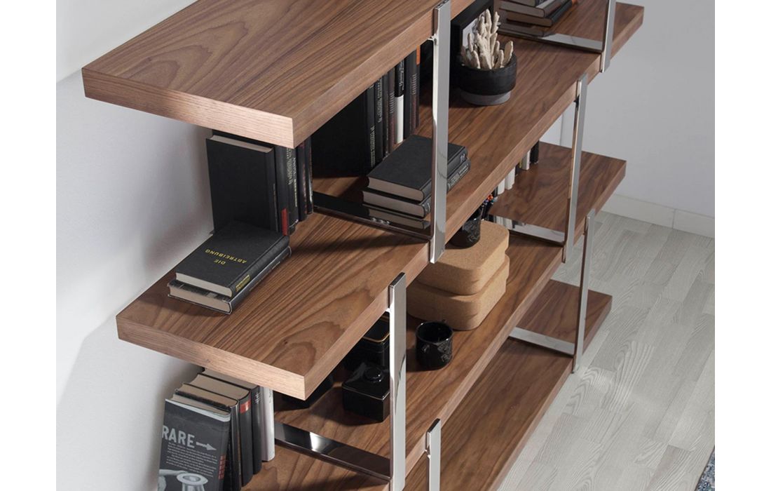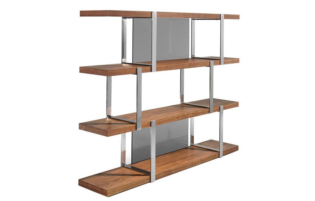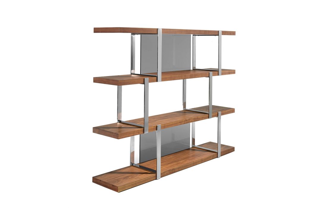 Livreiro em madeira folheada a nogueira e estrutura em aço cromado. Detalhes e divisórias em vidro translúcido pretoDestinatário :