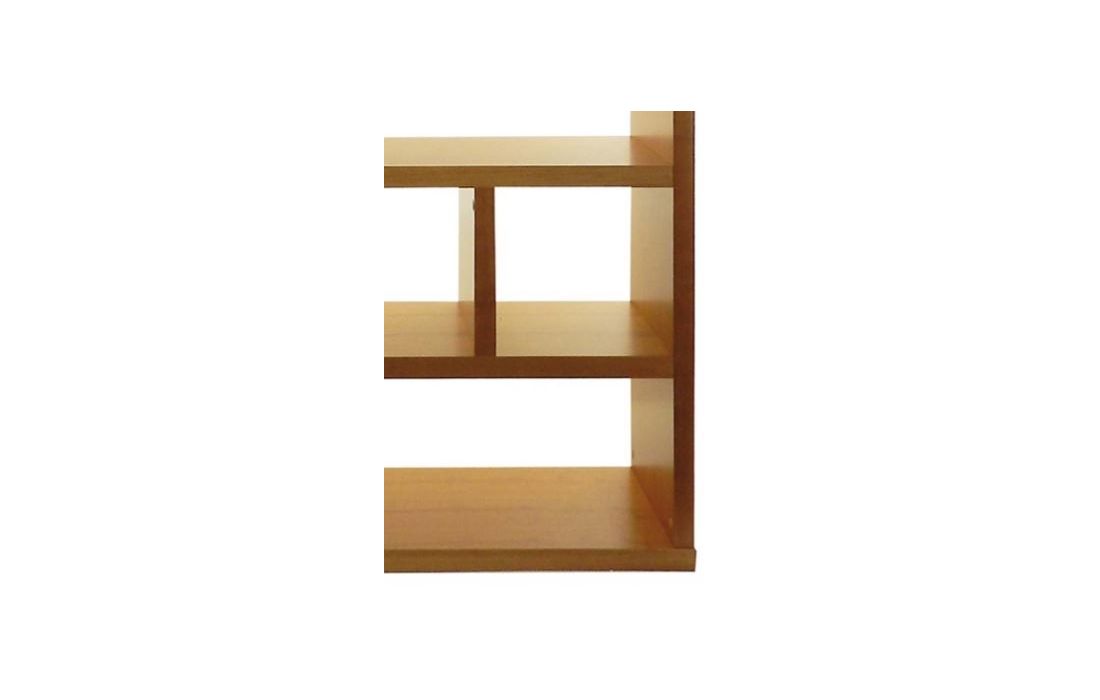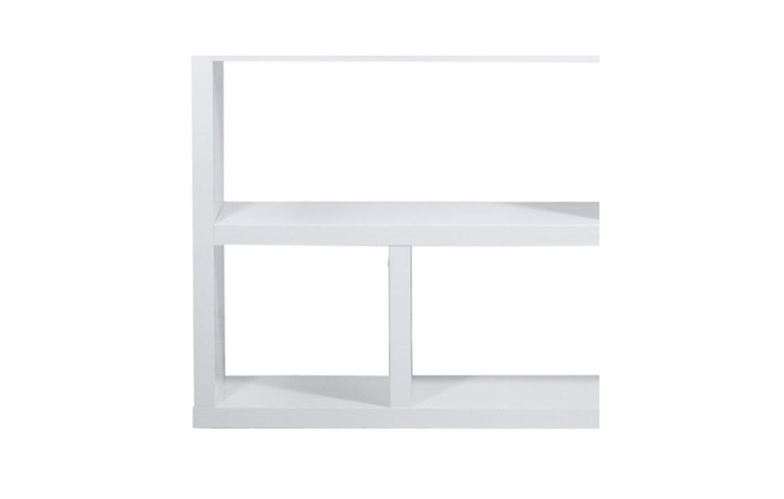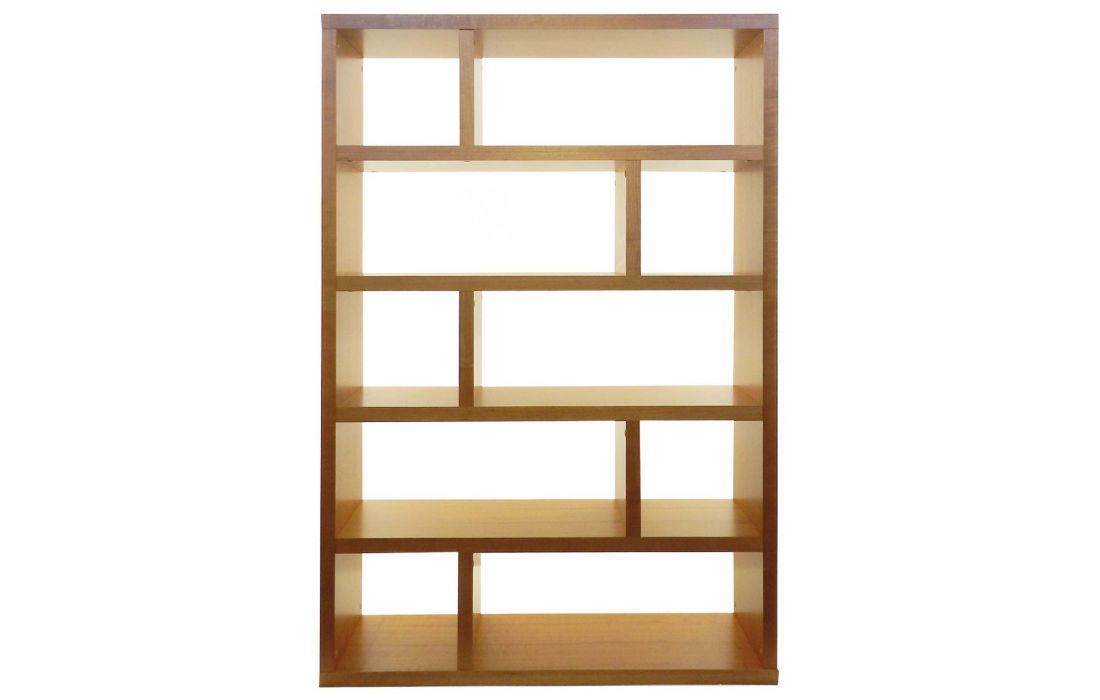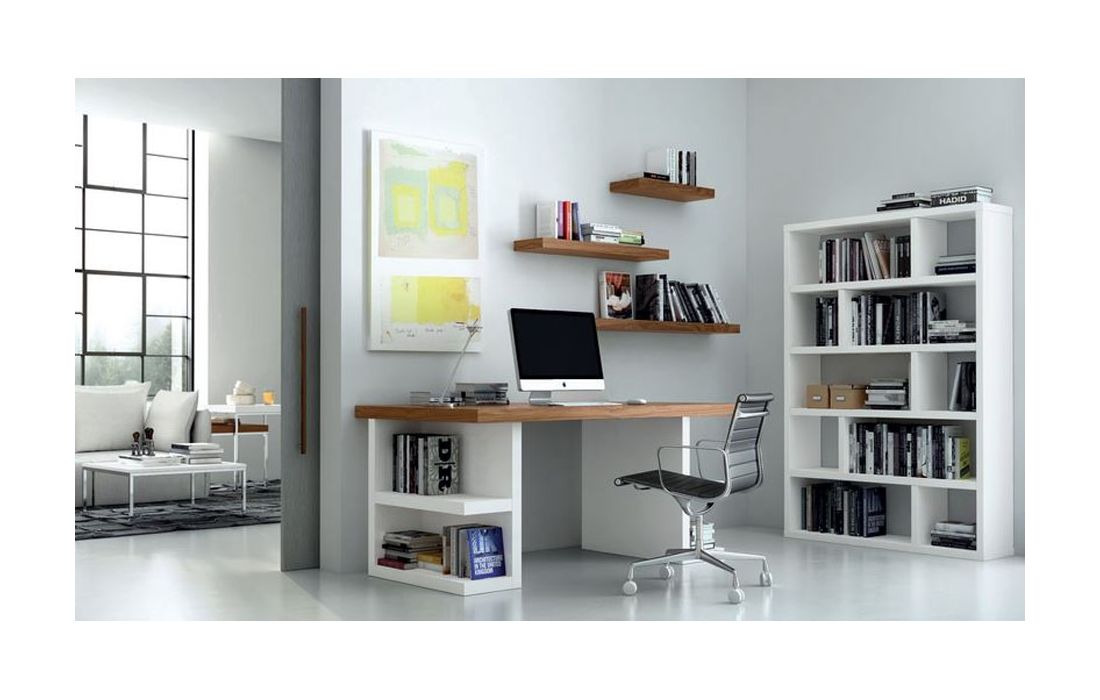 Livreiro com geometria linear, característica pelo seu acabamento em madeira Mukali, também disponível em branco puro