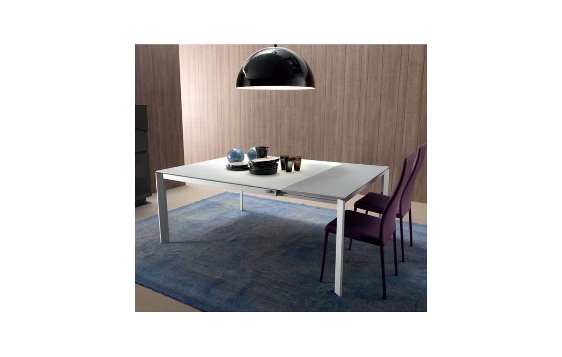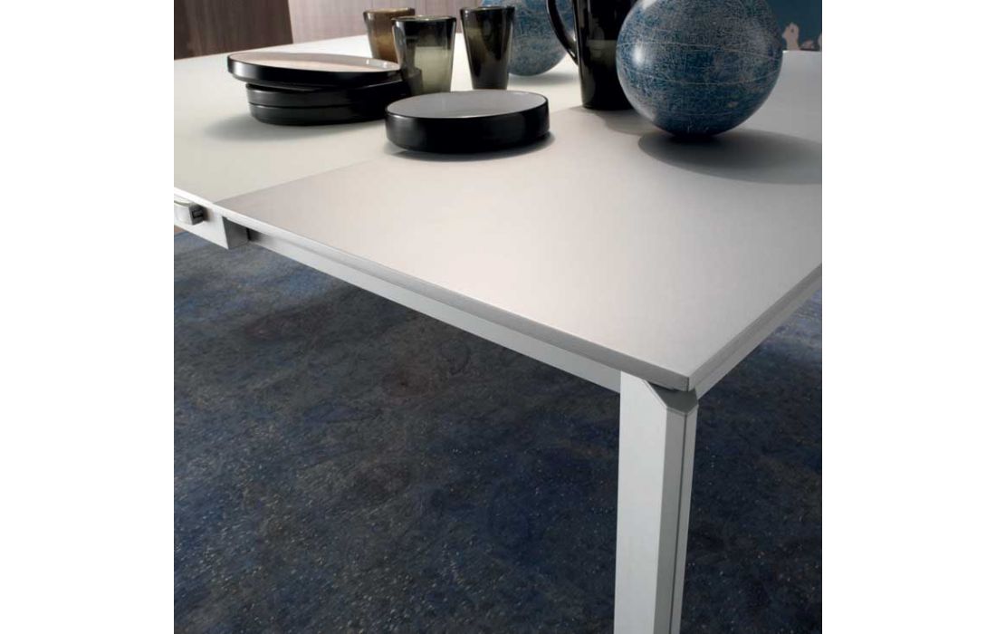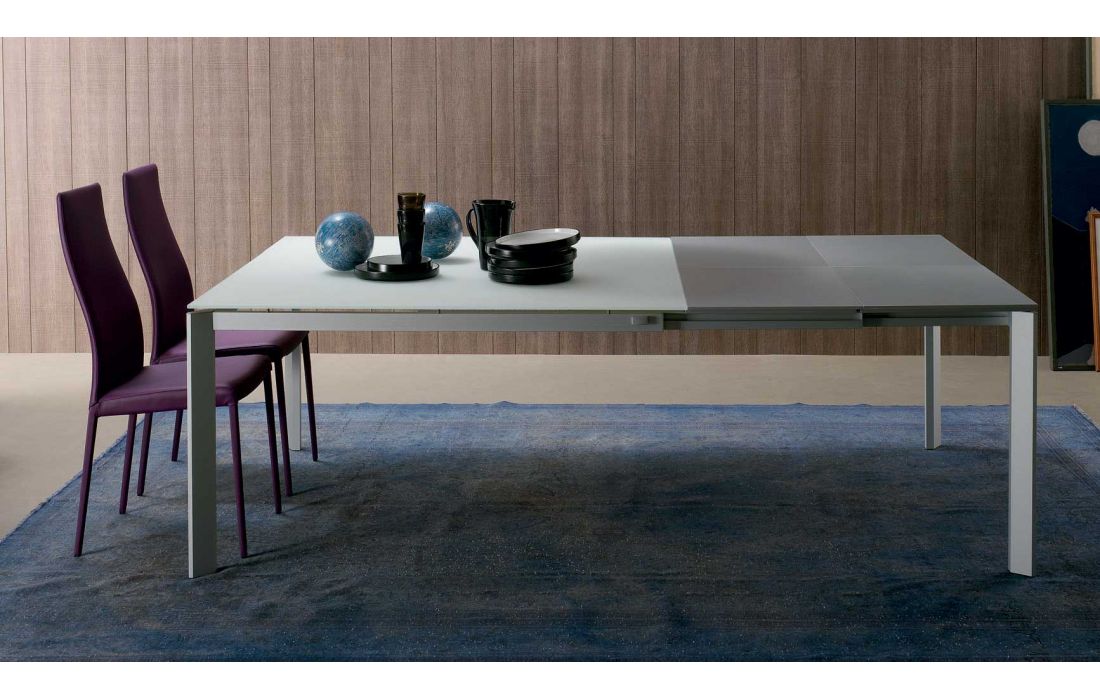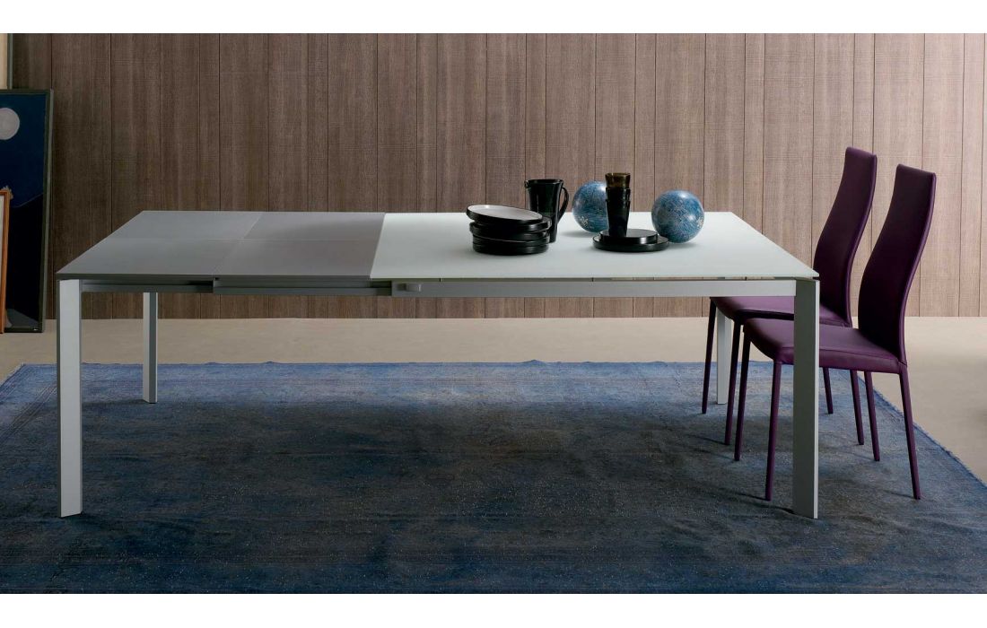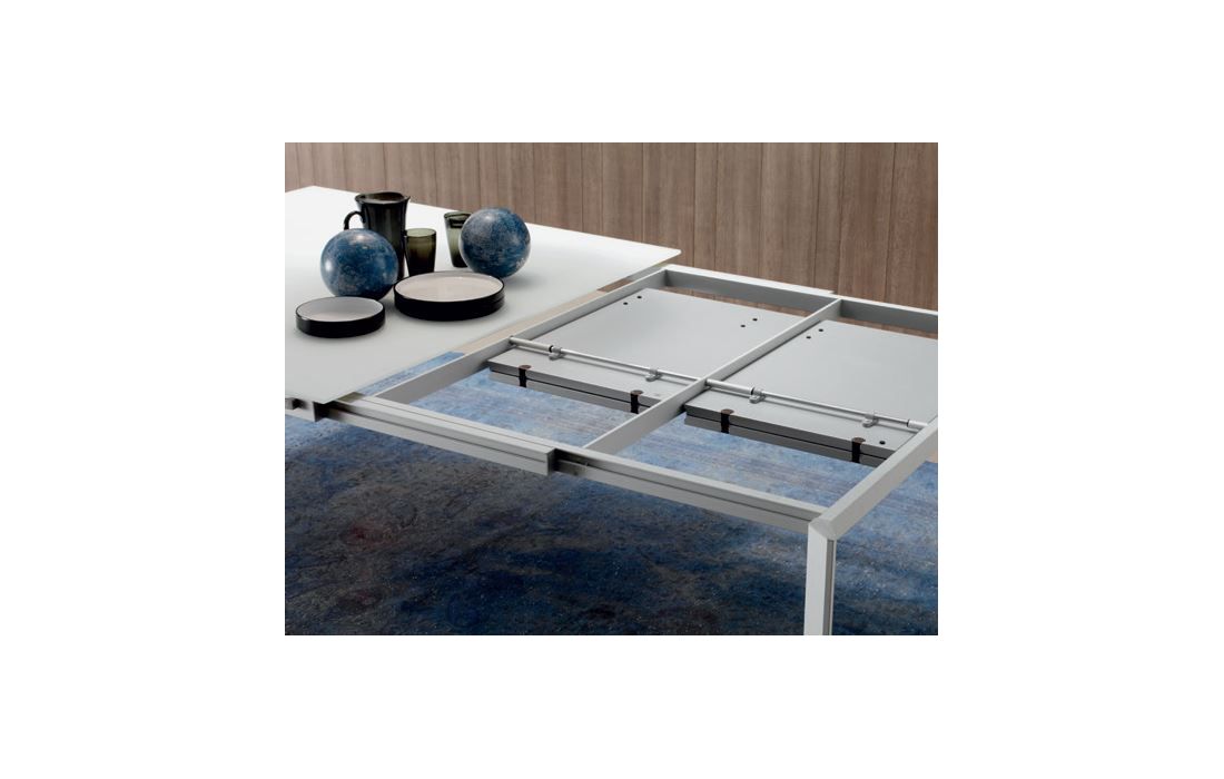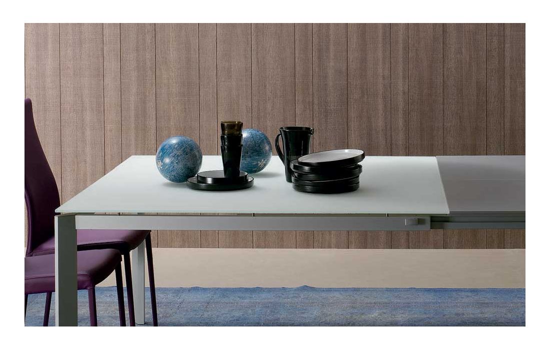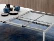 Mesa extensível com extensão de (50cm cada lado), com pés em alumínio anodizado prata e tampo em vidro extra claro branco ou cinza