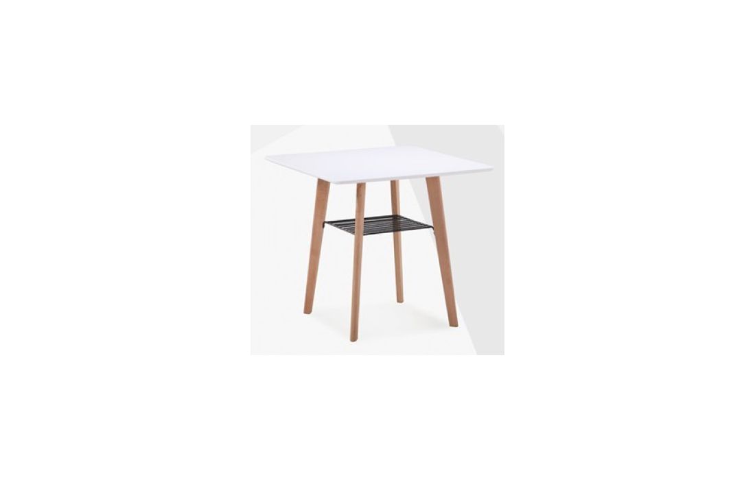 Mesa com pés em madeira faia, pormenor em metal e tampo quadrado em MDF de cor branco.