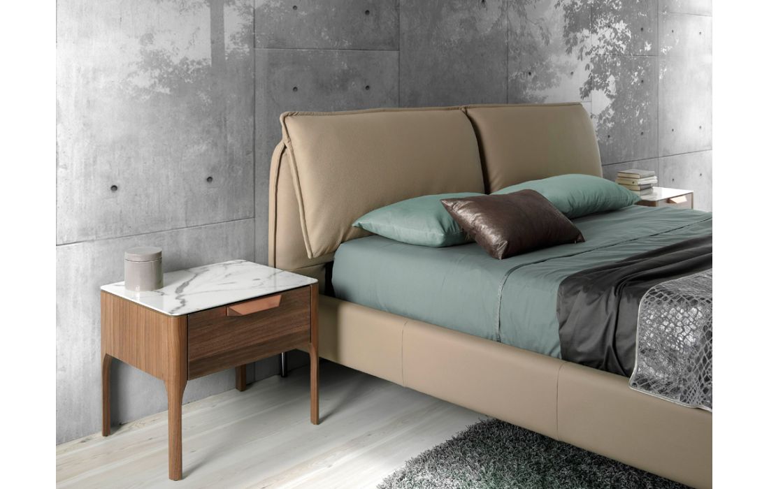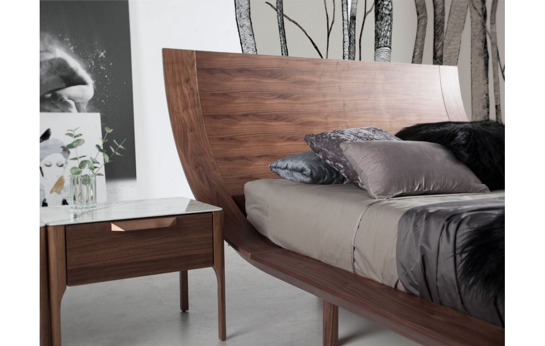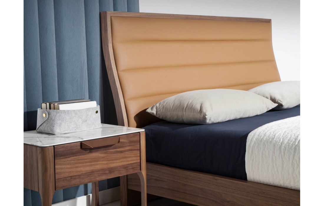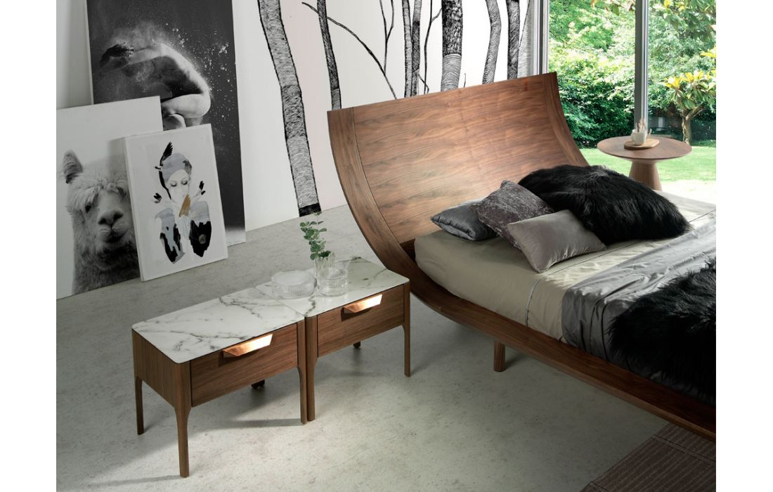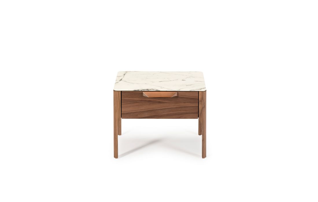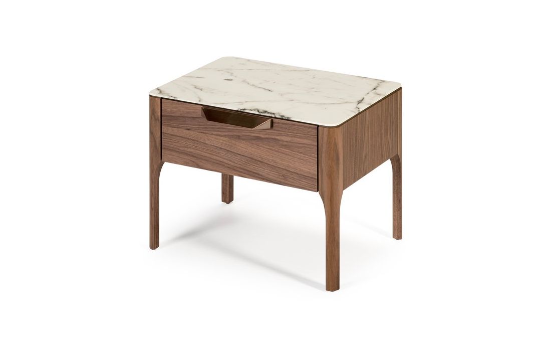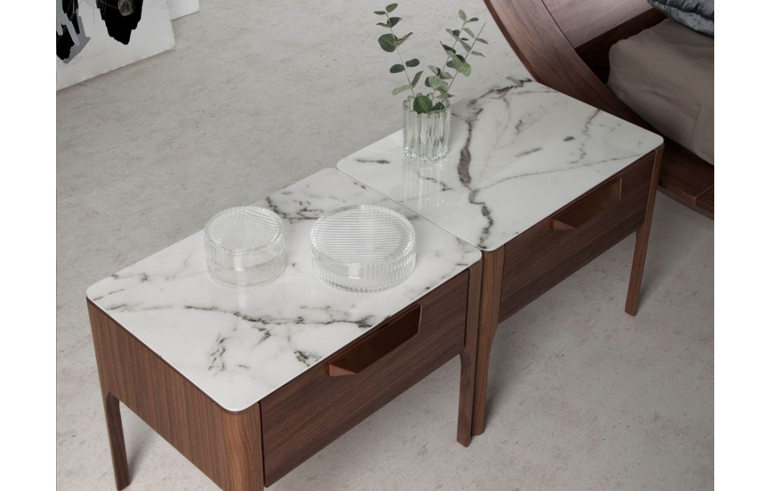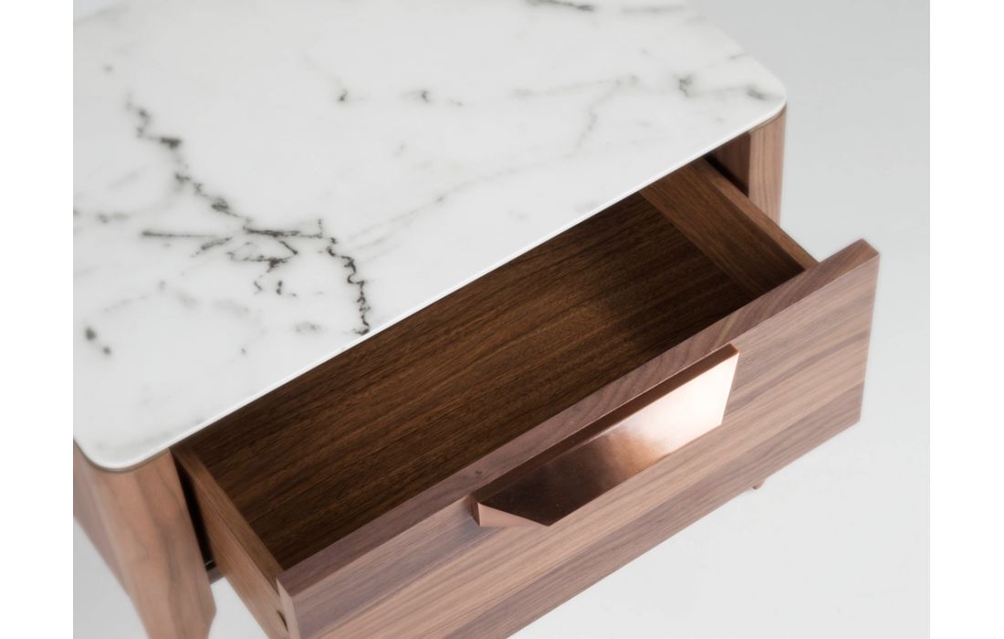 Mesa de cabeceira de design moderno com estrutura em MDF de nogueira natural e pernas MDF de nogueira natural, tampo de vidro com efeito mármore em porcelana, com 1 gavetaDestinatário :