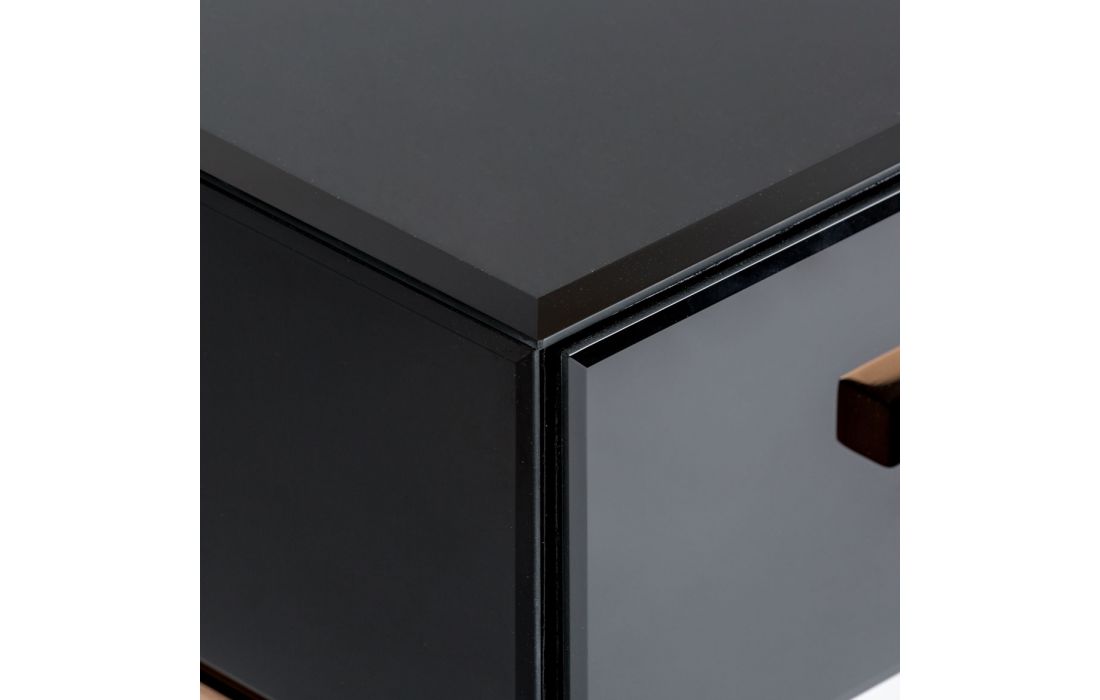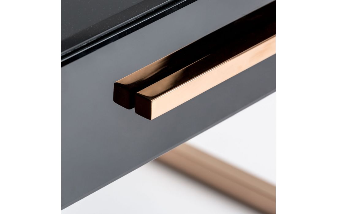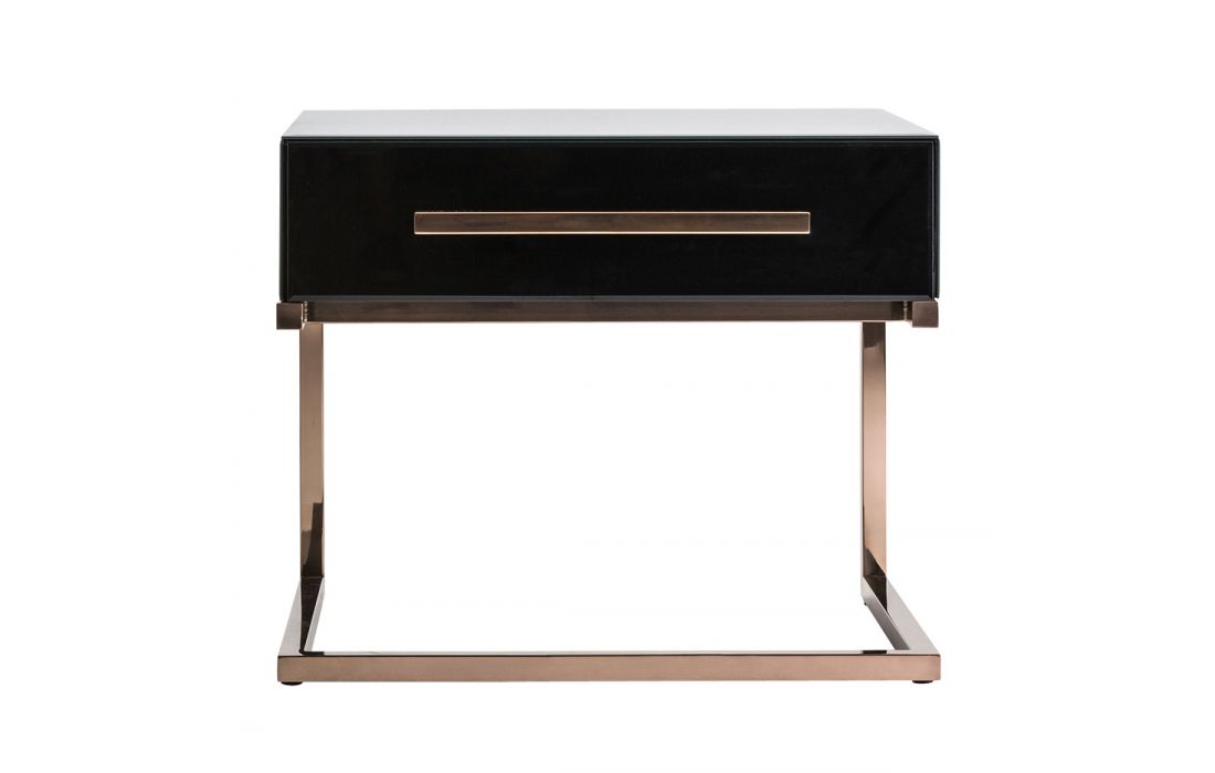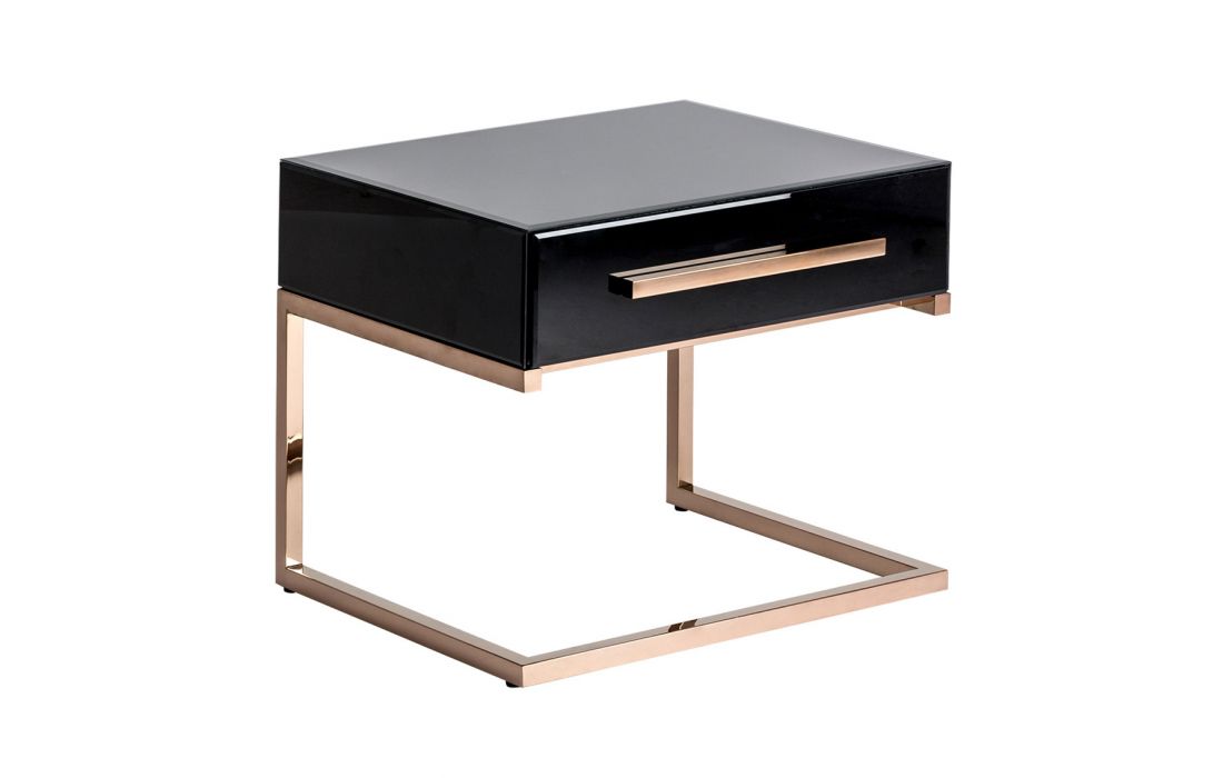Mesa de cabeceira de cor preta e cobre, estilo art deco, feita em espelho e aço.