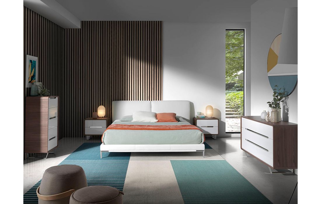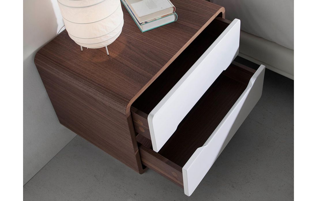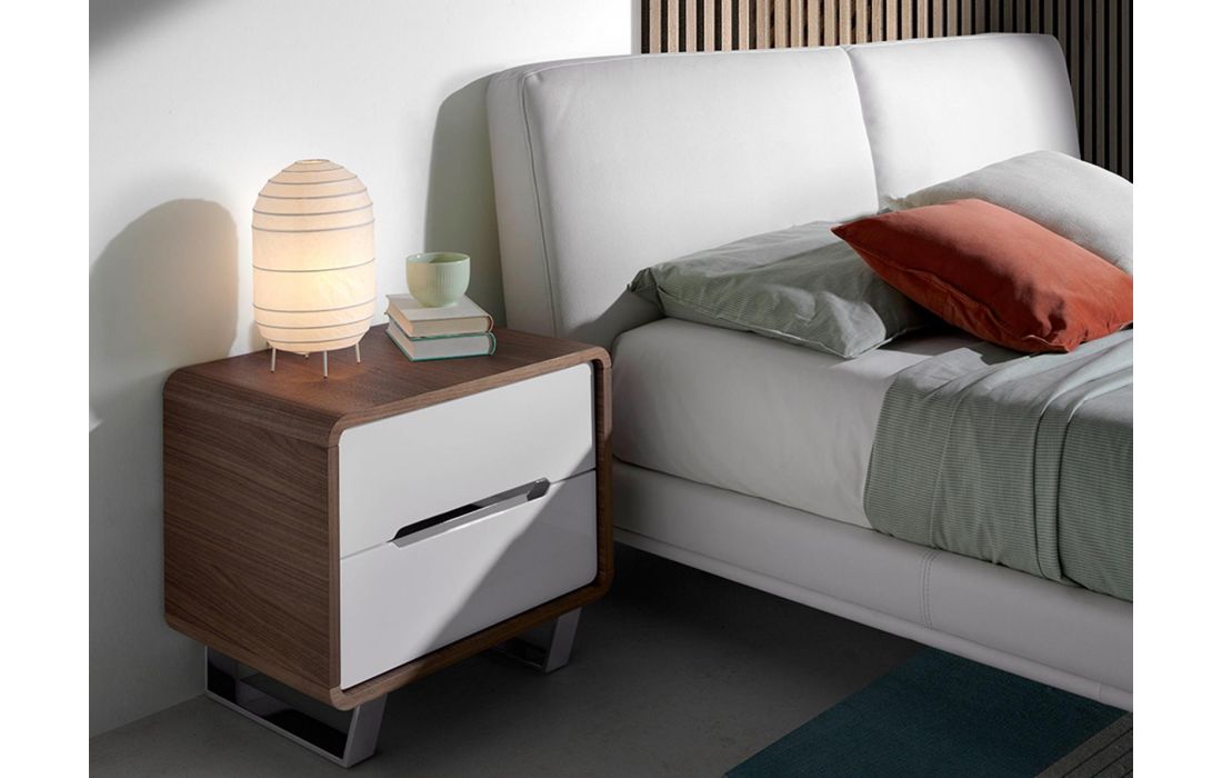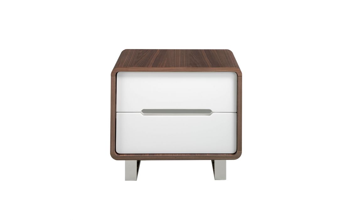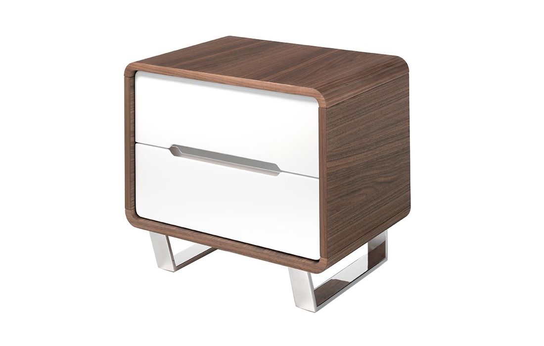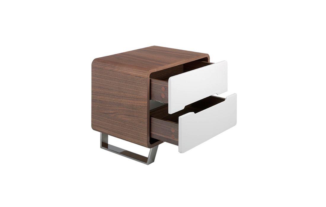Mesa de cabeceira em madeira folheada a nogueira com duas gavetas em MDF lacado branco brilhante. Pés em aço inox cromado.
