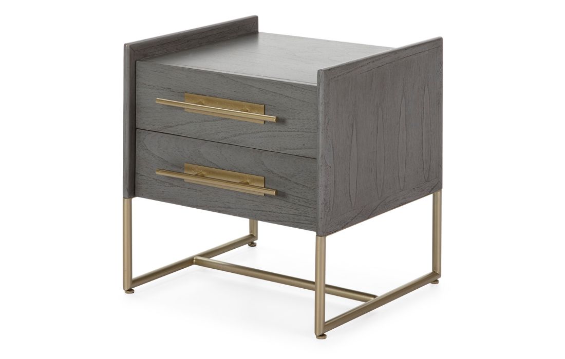 Mesinha cabeceira com 2 gavetas em madeira de cor cinza, com base e puxadores em metal dourado.