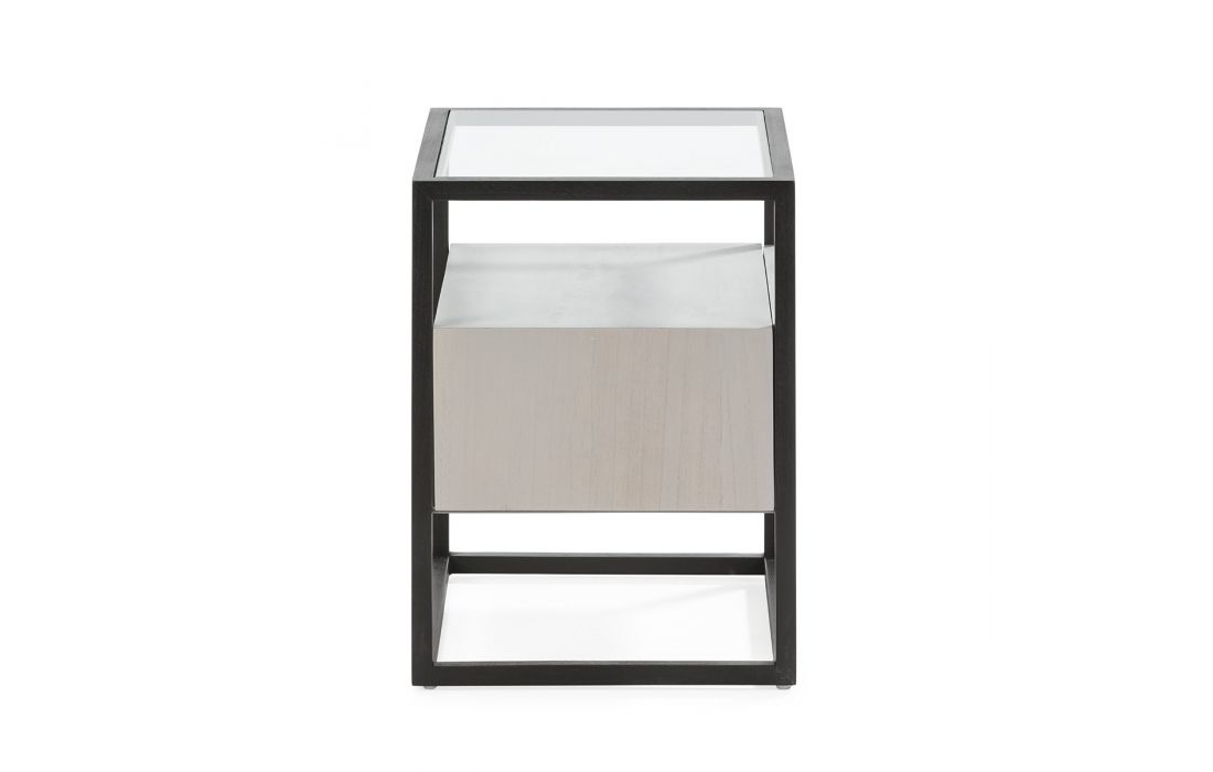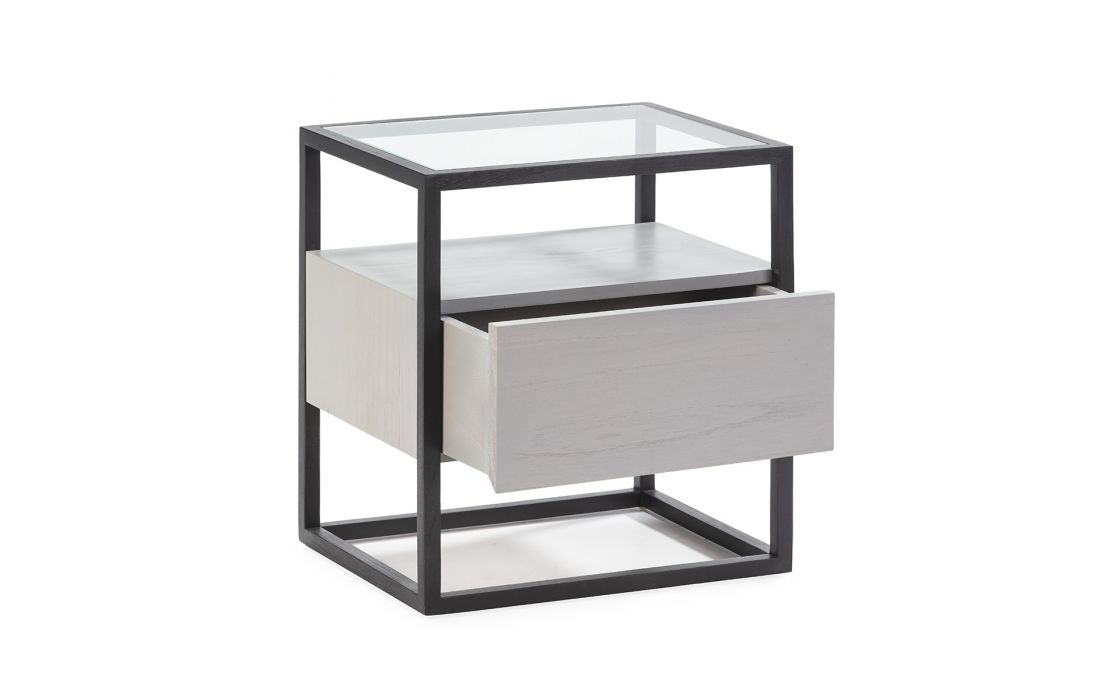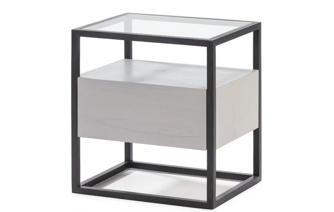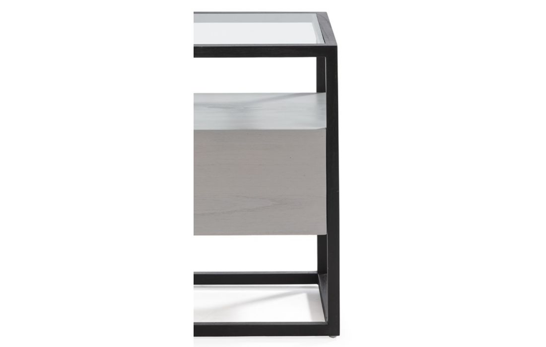 Mesa de cabeceira em madeira natural cinza com vidro e uma gaveta.