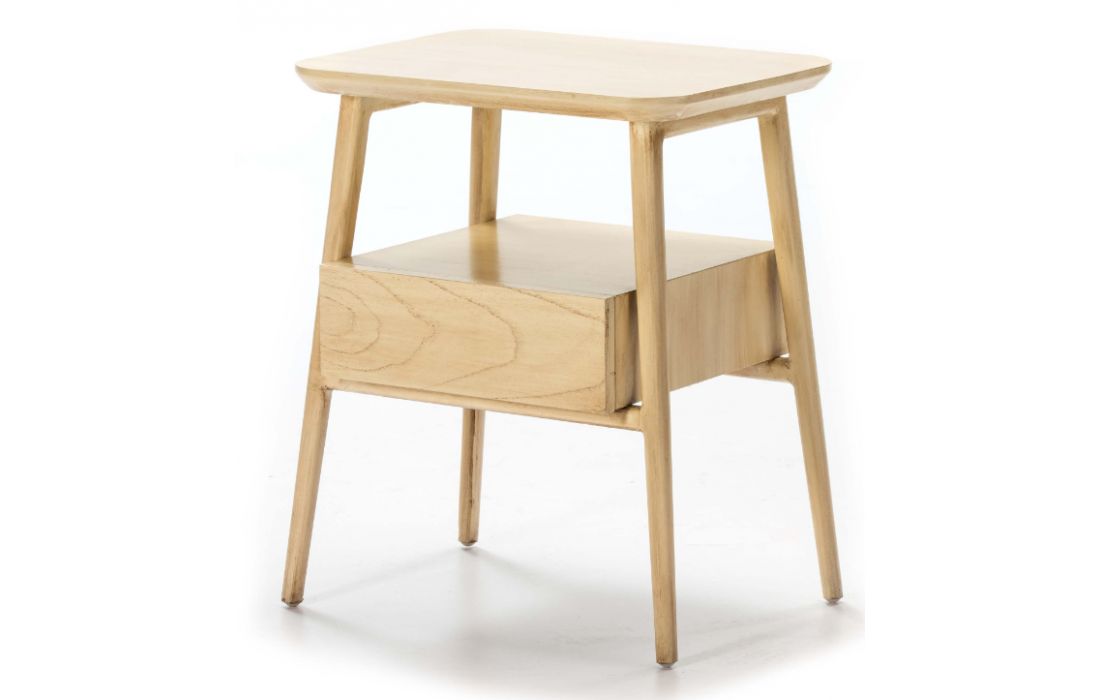 Mesa de cabeceira em madeira vendada de cor branca com uma gaveta.