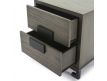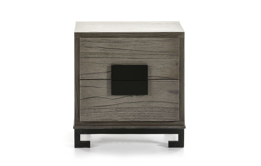 Mesa de cabeceira em madeira cor cinza, com duas gavetas e com os puxadores e pés em madeira de cor preta.