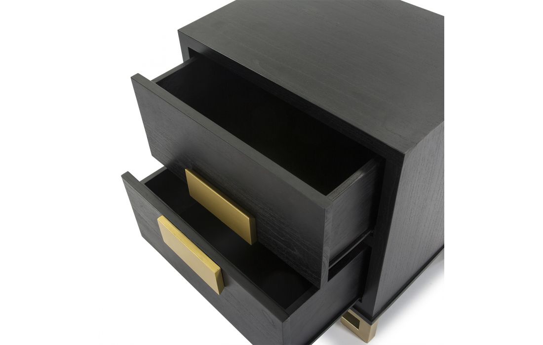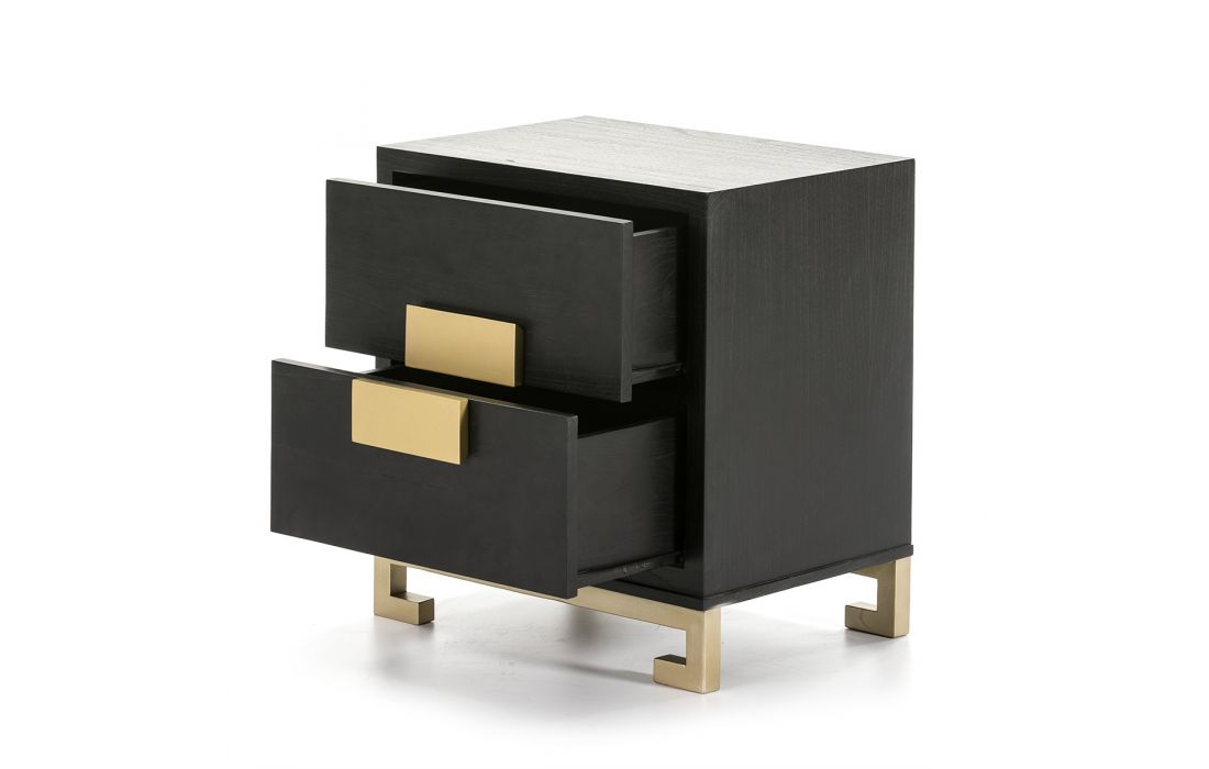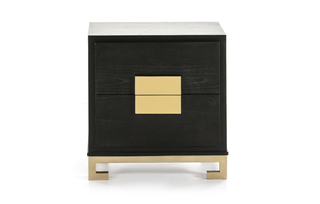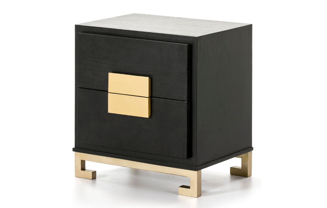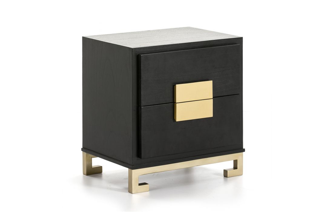 Mesa de cabeceira em madeira cor castanha, com duas gavetas e com os puxadores e pés em madeira de cor dourada.