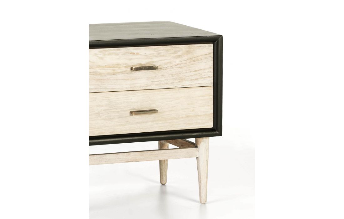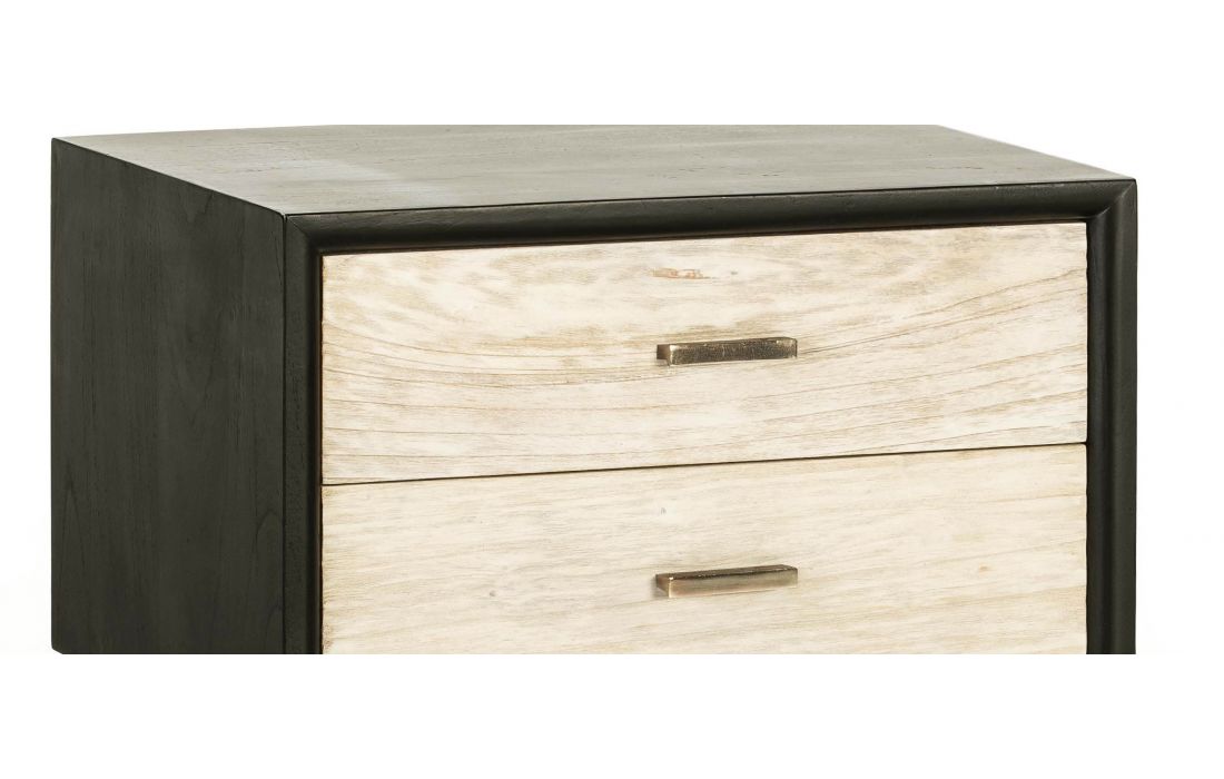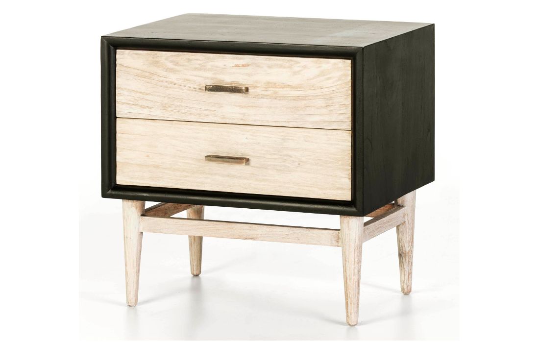 Mesa de cabeceira em madeira cor preta, com duas gavetas / pés em cor branco lavagem e com puxadores em dourado.