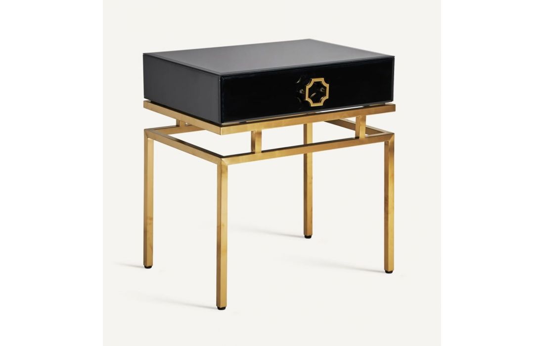 Mesa de cabeceira estilo art déco feita em aço e cristal nas cores preta e dourada