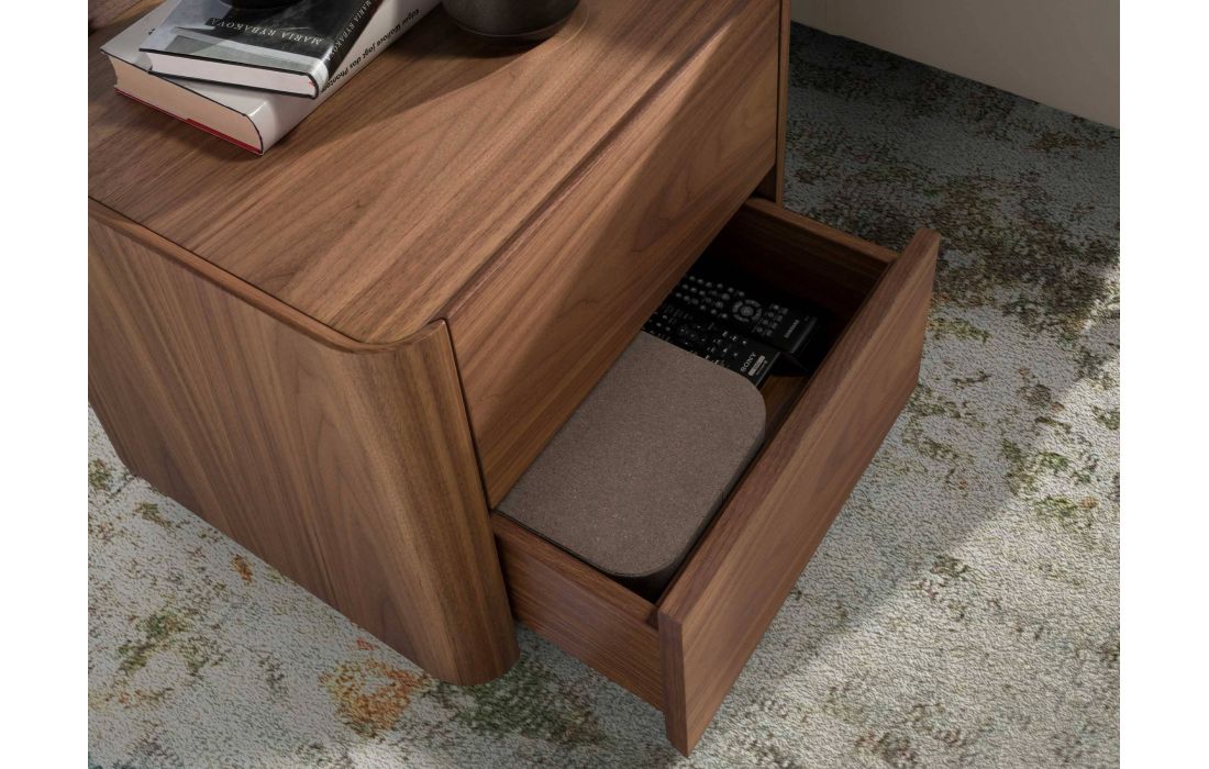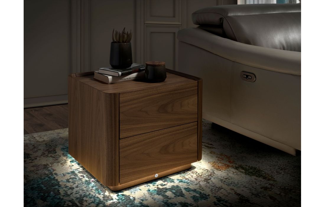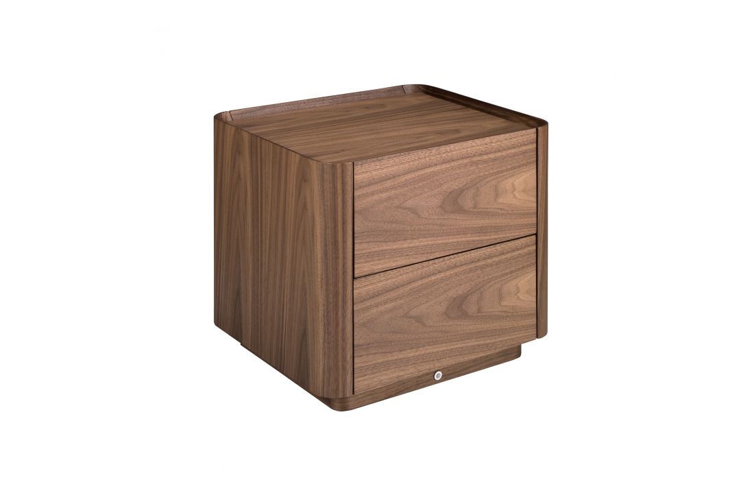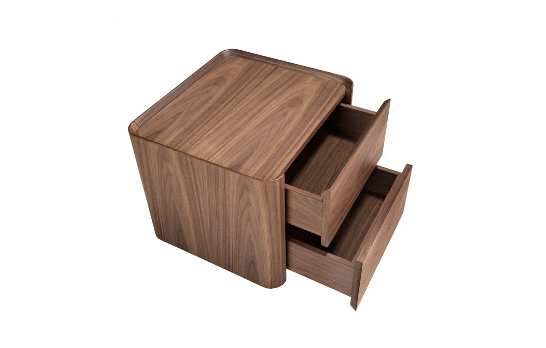 Mesa de cabeceira de design moderno com estrutura e base em madeira folheada a nogueira. Possui um amplo espaço de armazenamento com 2 gavetas com sistema de abertura de dedos e fechamento suave.