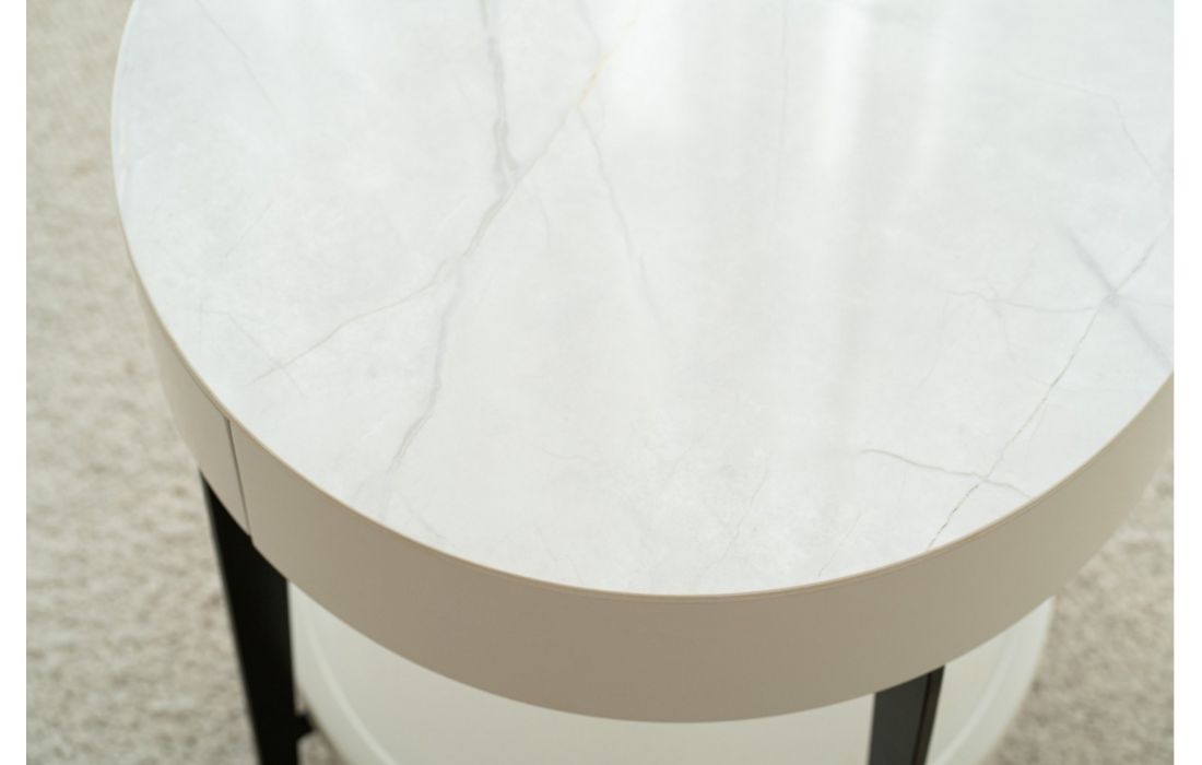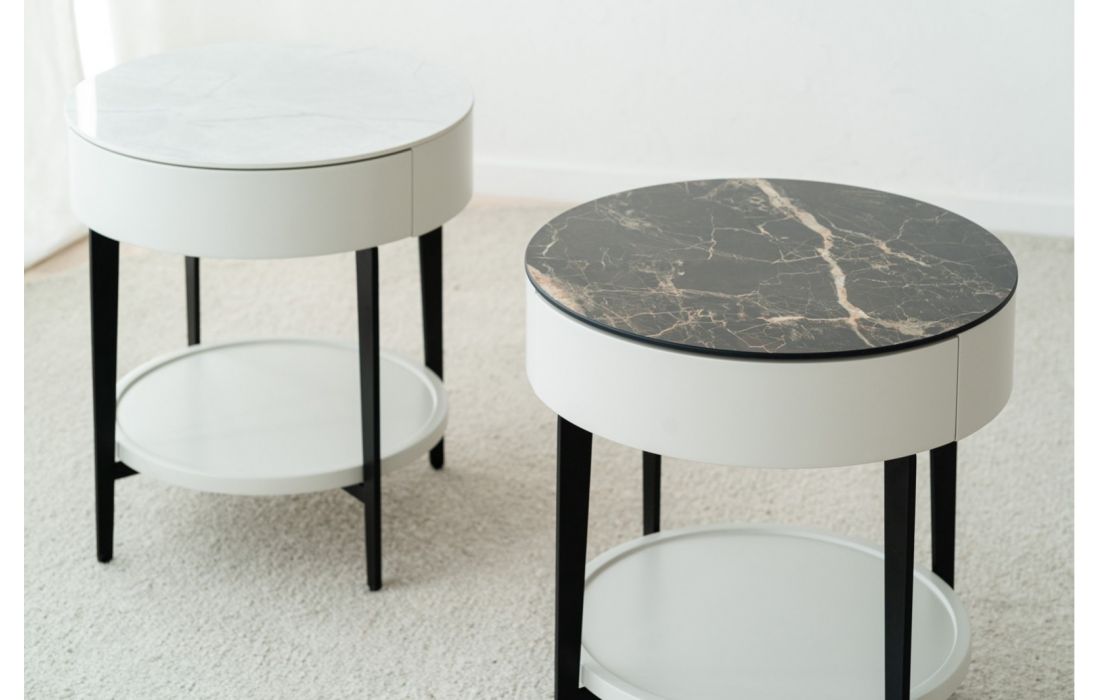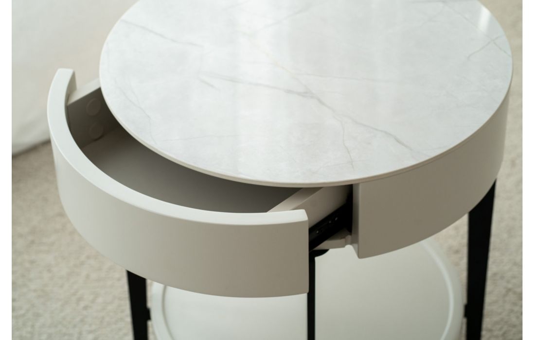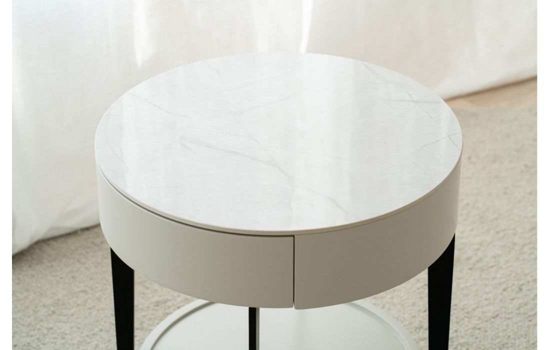 Mesa de cabeiceira composta por estrutura metálica na cor preto fosco, tampo cerâmico nos tons brancos e cinza e corpo em madeira de freixo na cor cinza areia foscoDestinatário :