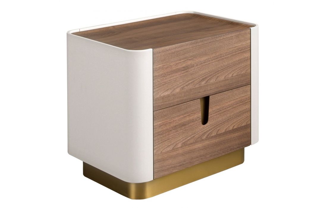 Mesa de cabeceira de design moderno com estrutura de madeira com chapa de noz natural e MDF, e uma base original de aço inoxidável polidoDestinatário :