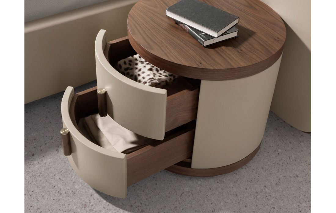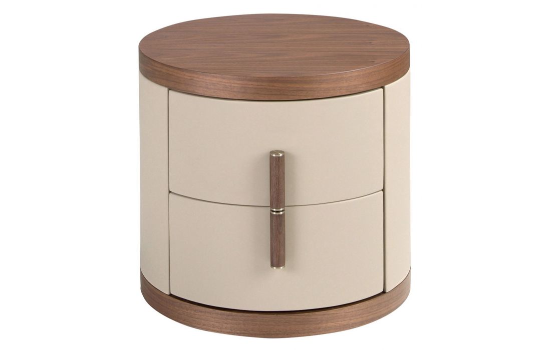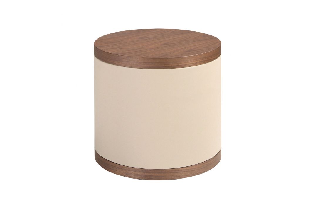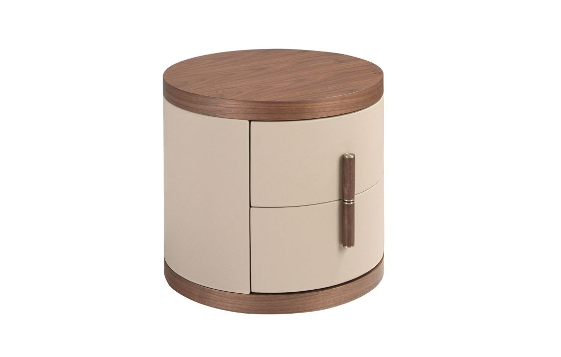 MESA DE CABECEIRA DREKE de design moderno com estrutura em folheado de nogueira natural e couro sintético , proporciona aspeto sofisticado aos ambientes.