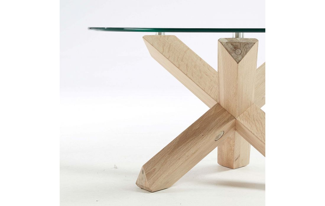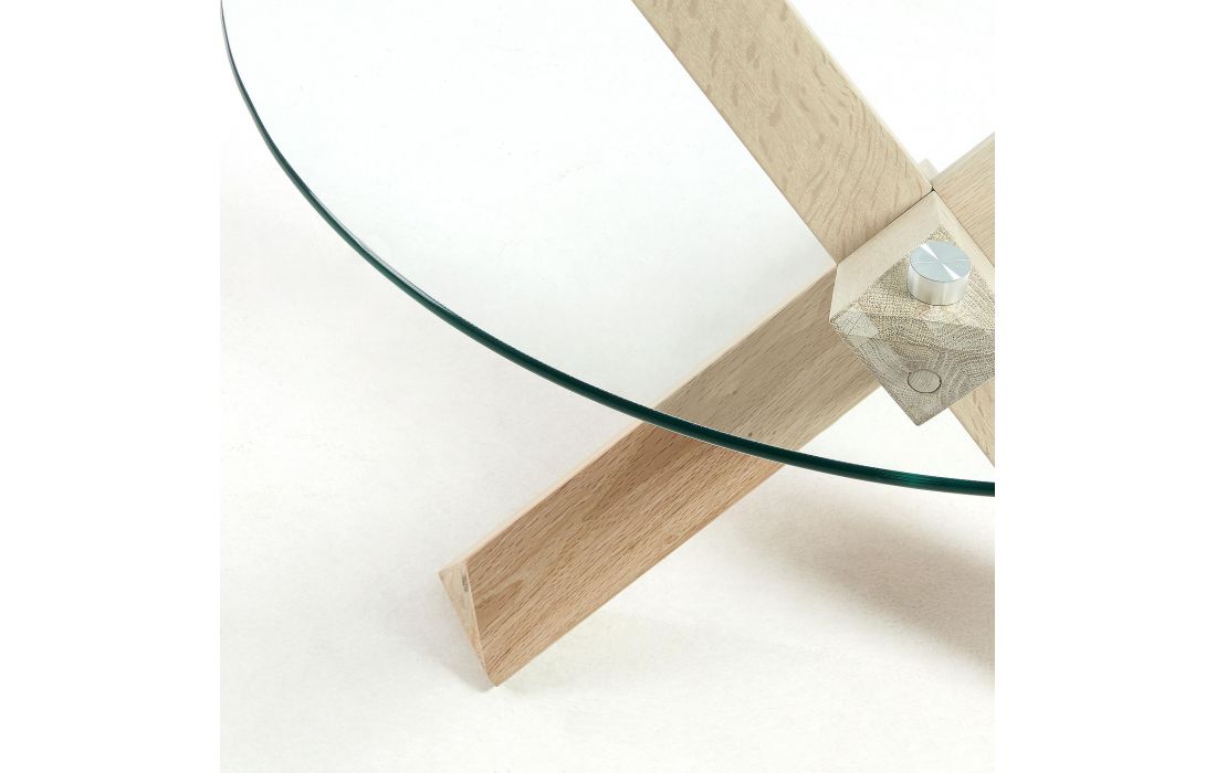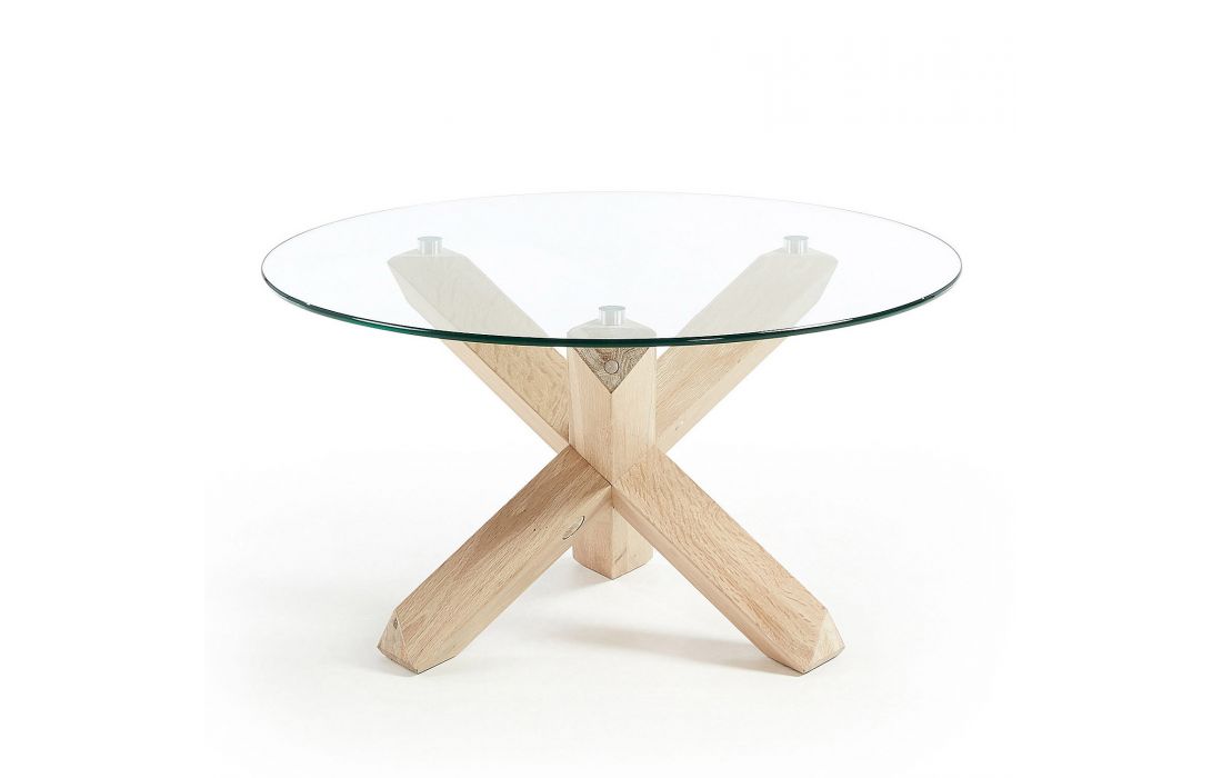 Mesa de centro com pés de carvalho maciço, acabamento branqueado e tampo de vidro.Destinatário :