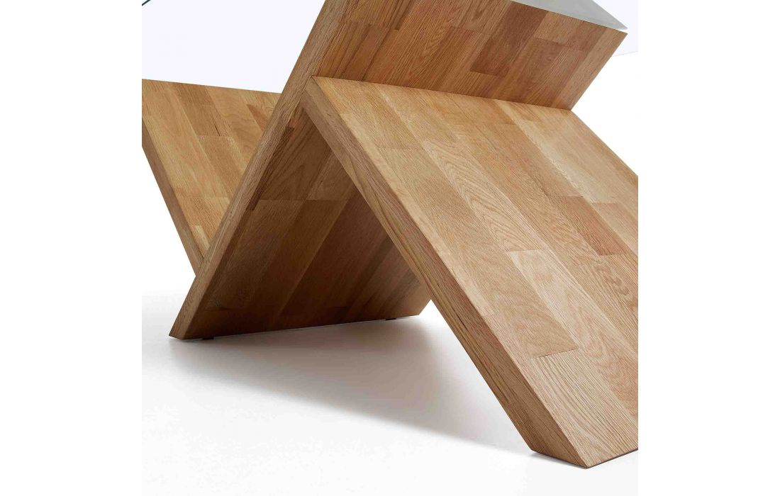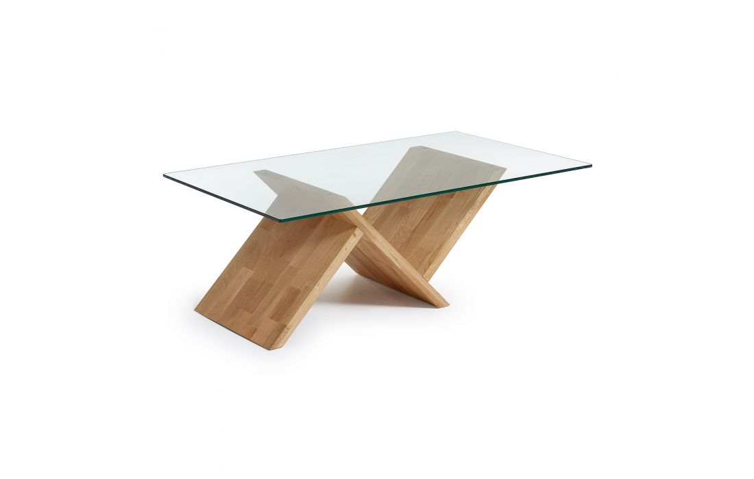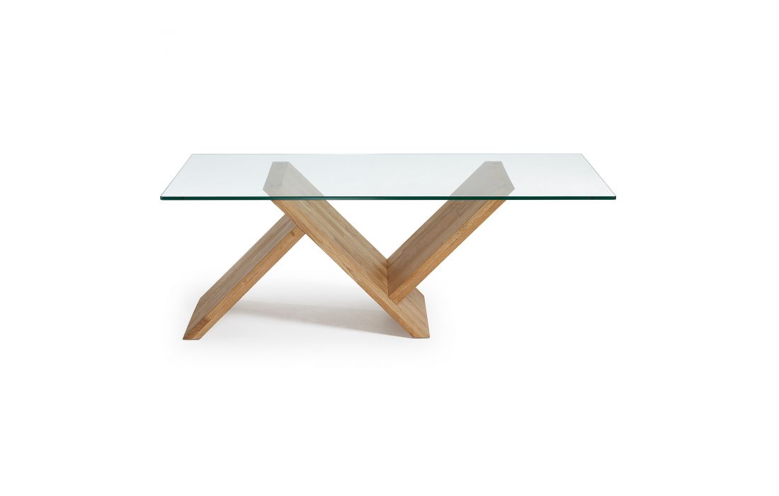 Mesa de centro com pé em carvalho e tampo de vidro transparente