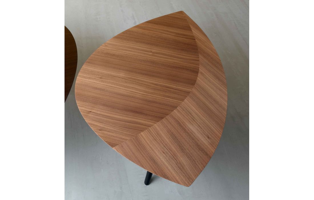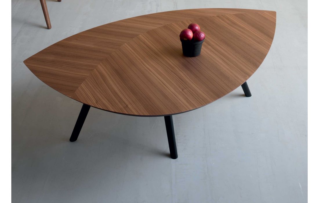 Mesa de centro com tampo em nogueira ou carvalho queimado com pés em madeira pintada de preto