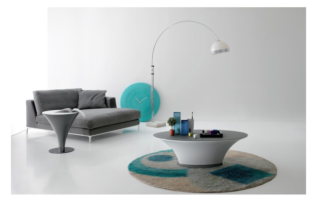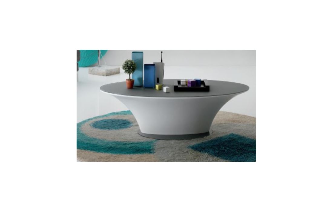 Mesa de centro oval com estrutura em poliuretano de cor branco, cinza ou bege com tampo em vidro beige, cinza ou branco e base em metal cinza