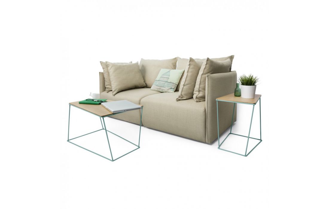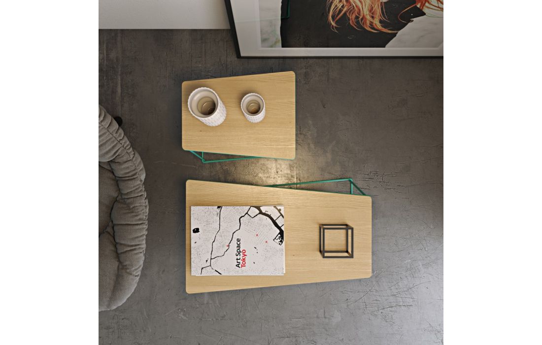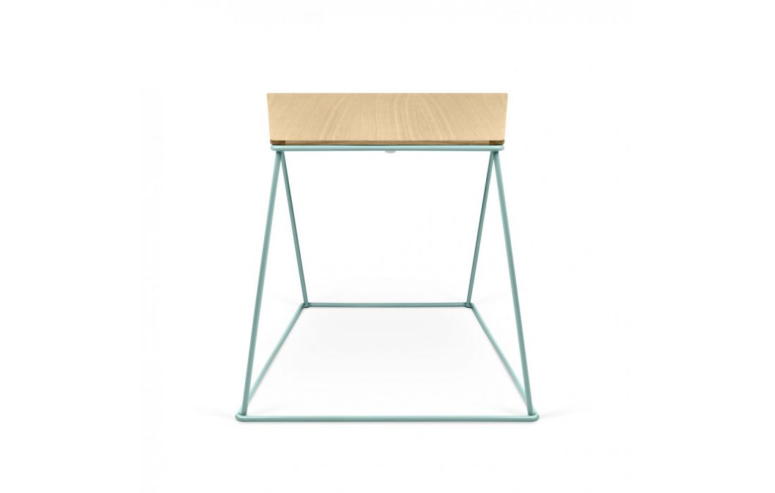 Mesa de centro original de linhas angulares com tampo em carvalho e pés metálicos em verde água.