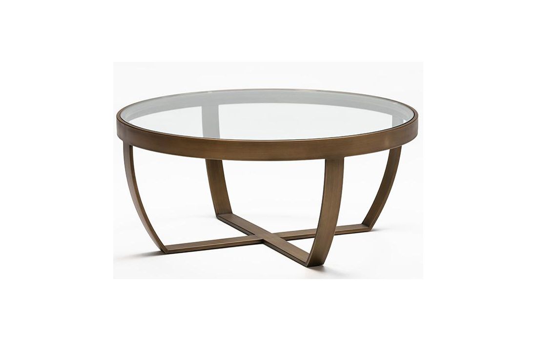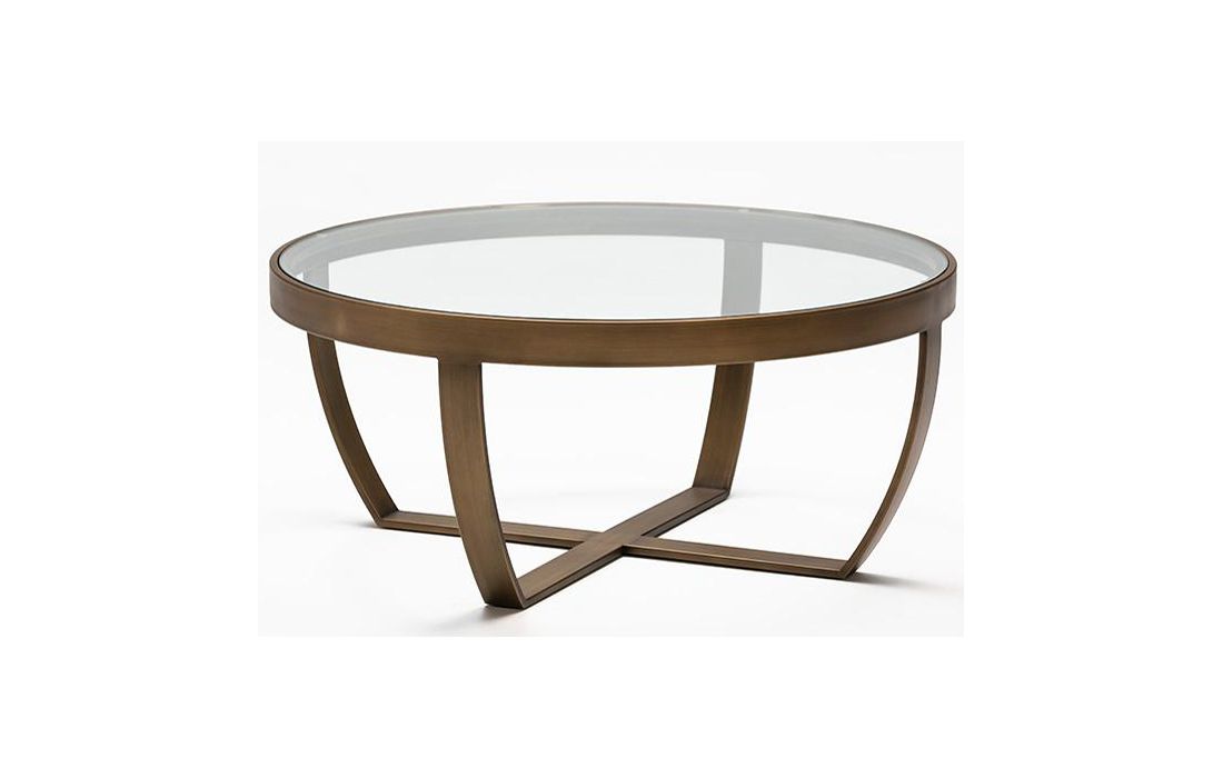 Mesa de centro com estrutura em metal bronze e tampo de vidro.