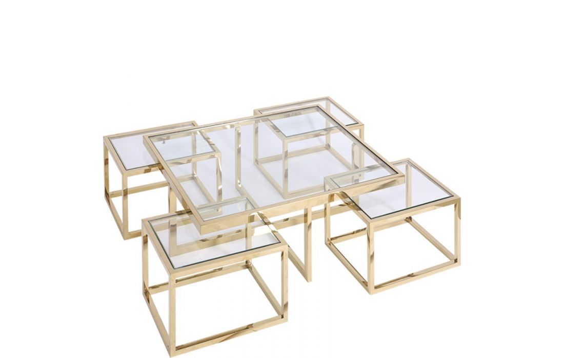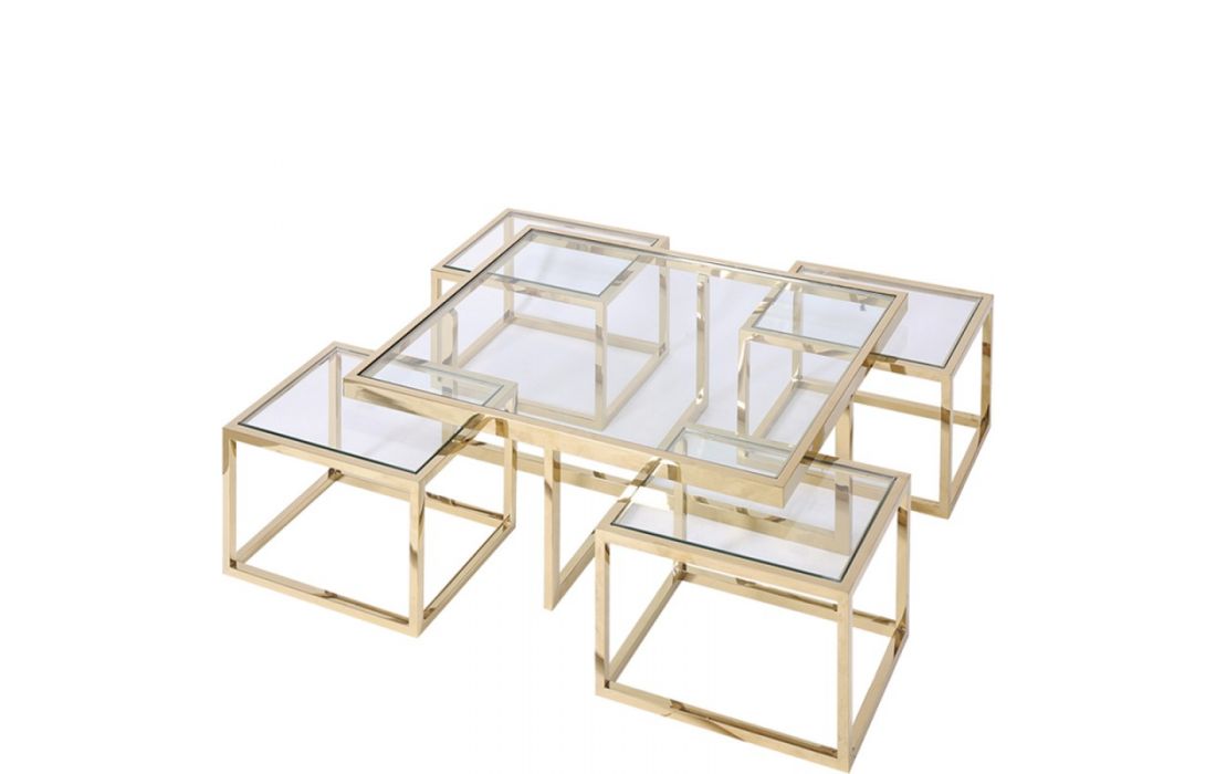 Mesa de centro com base em aço inox e tampo em vidro.