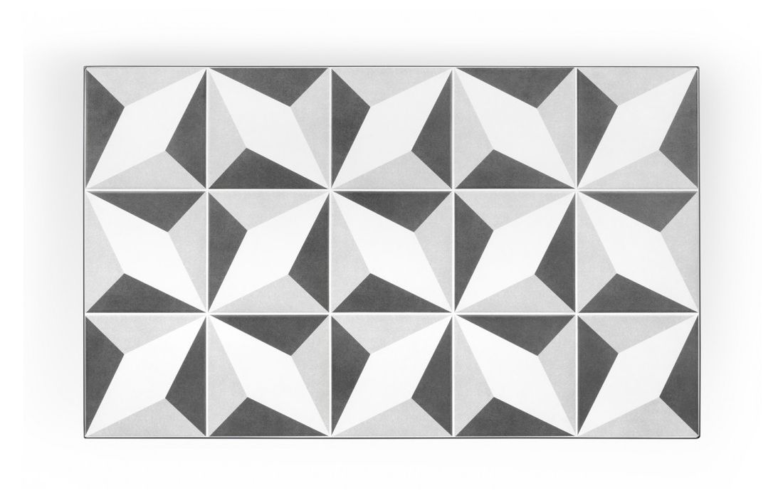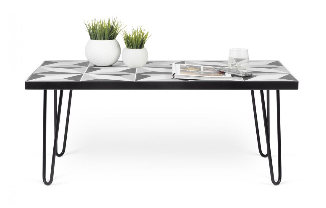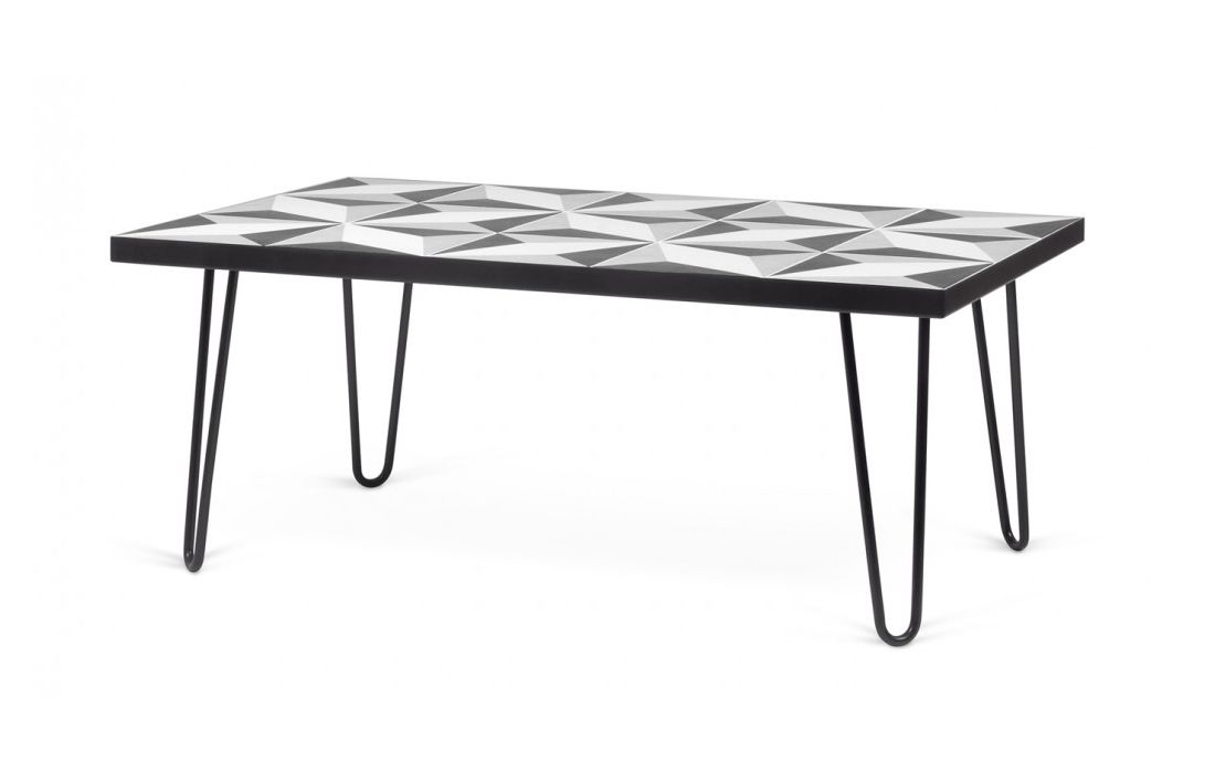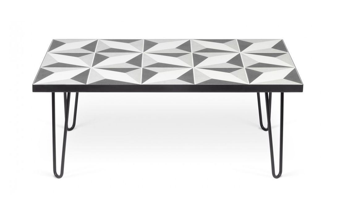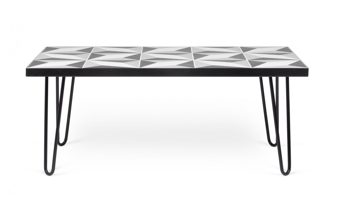 Mesa de centro que tem por característica um tampo de azulejos, que em conjunto criam um apelativo padrão geométrico emoldurado por uma estrutura metálica em contraste com pés metálicos.