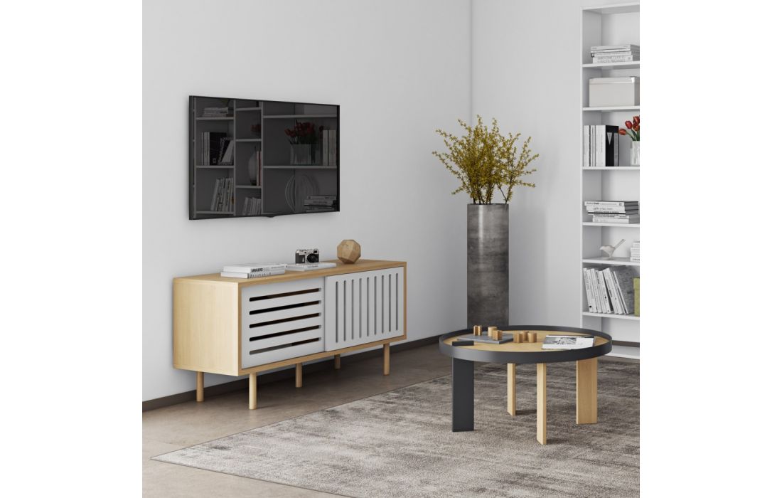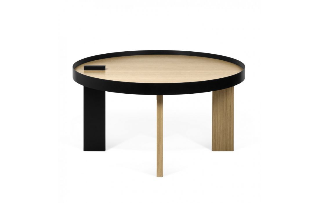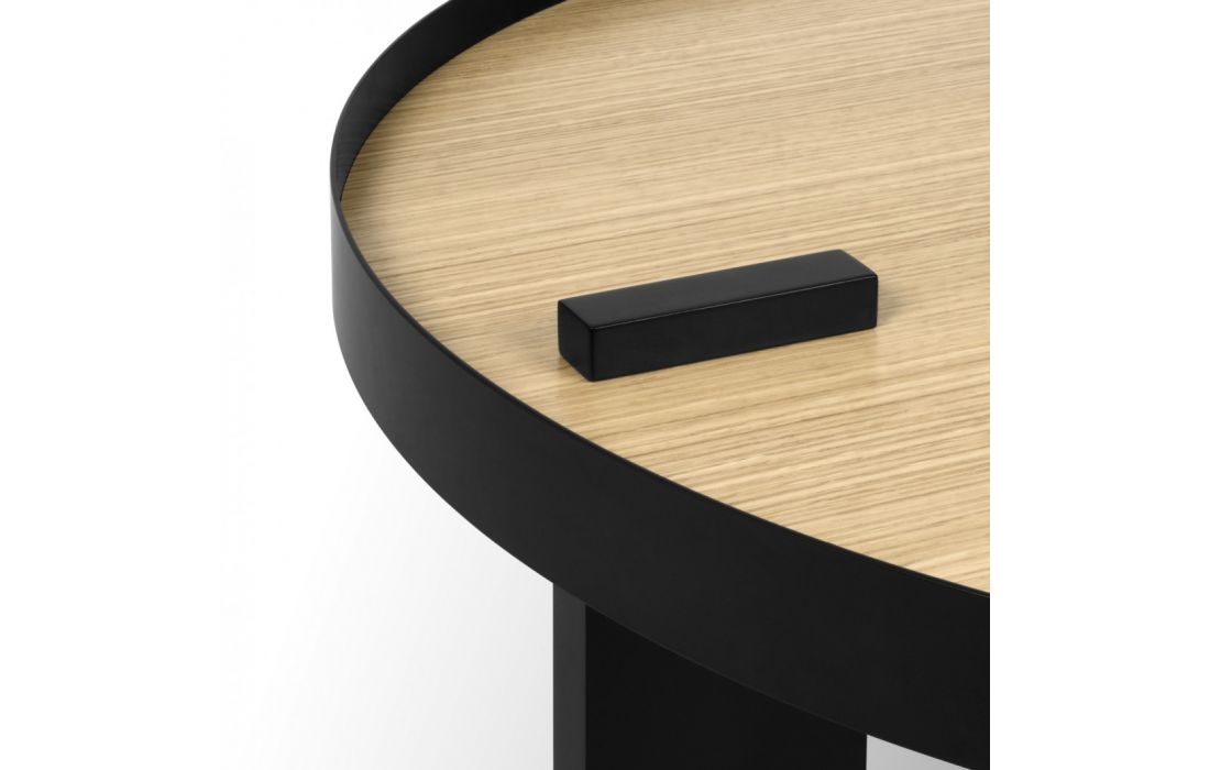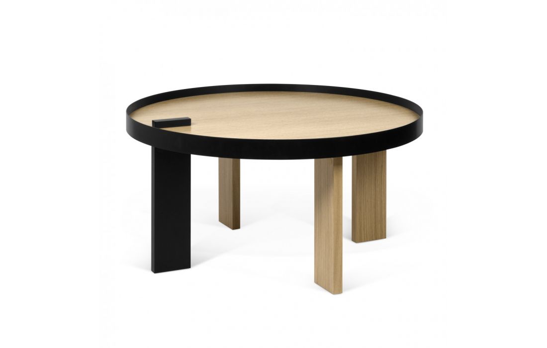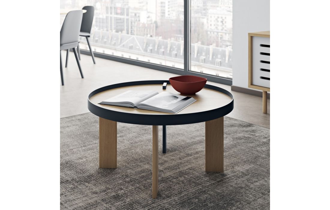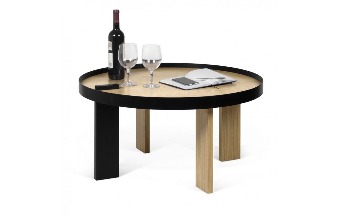 Mesa de centro com contraste entre a perna preta e a estrutura metálica da mesma cor, com o carvalho folheado da restante peça, acentua ainda mais o seu visual, para tornar seu ambiente ainda mais bonito.