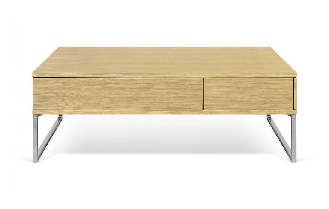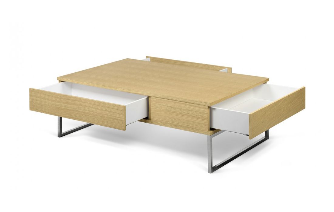 Mesa de centro com 3 gavetas, em carvalho folheado e pés metal cromado.