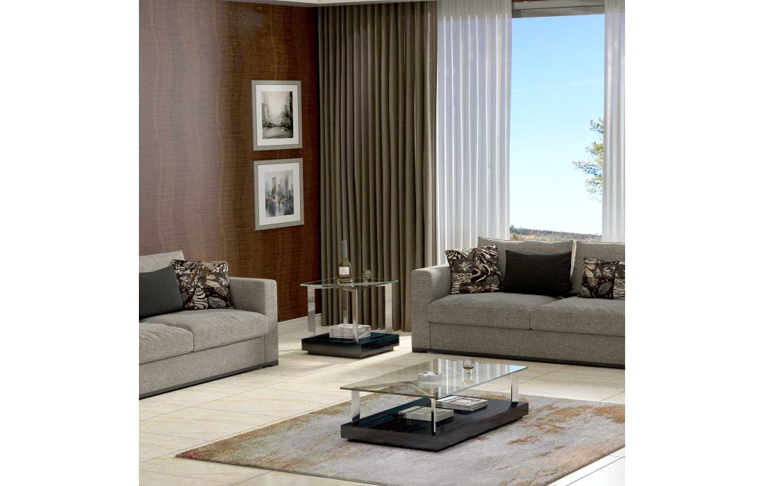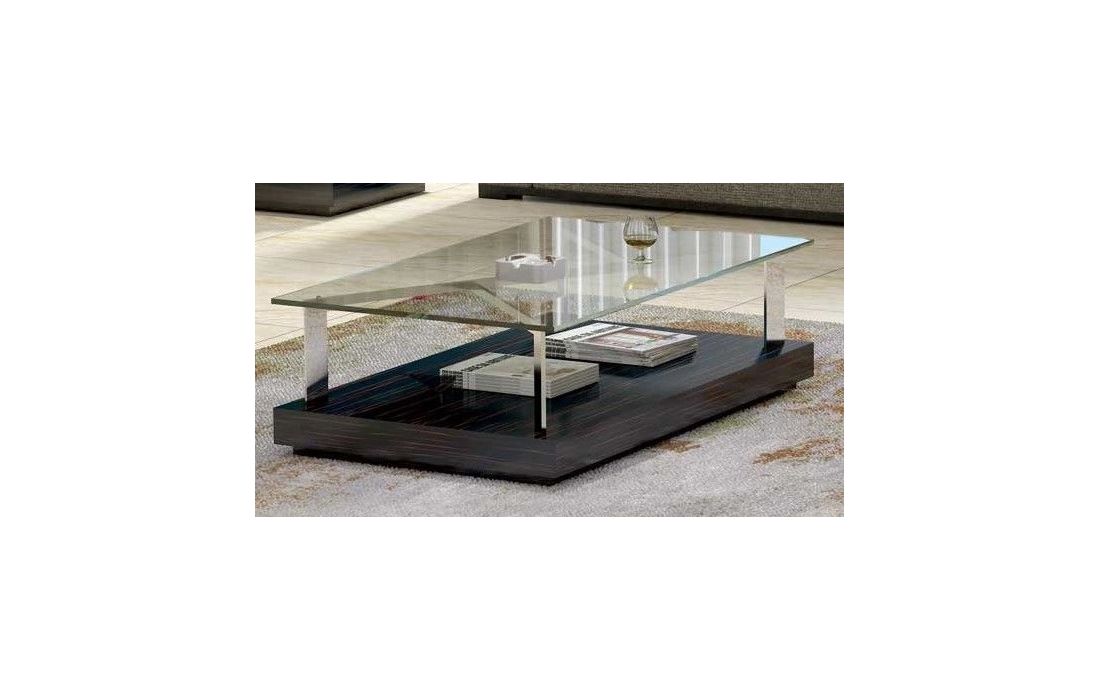 Mesa de centro com tampo em vidro e pormenor metalico