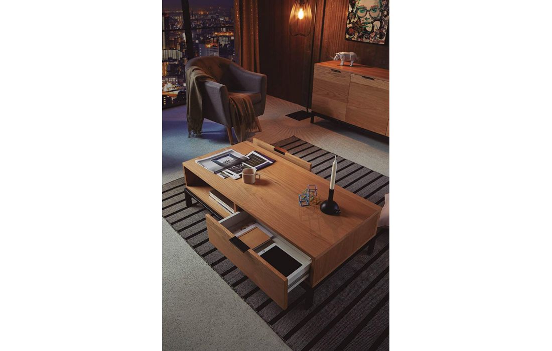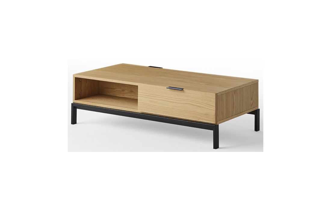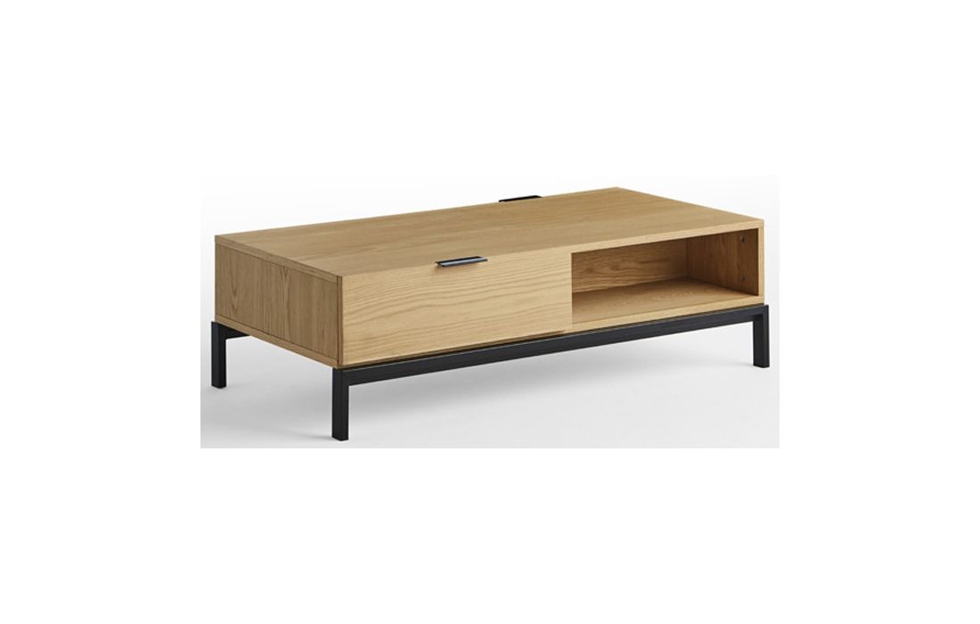 Mesa de centro folheada em carvalho com pés em metal preto.Destinatário :