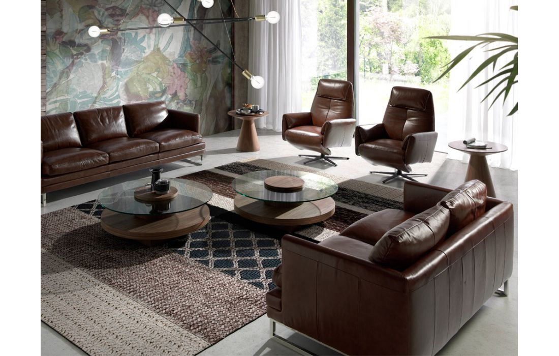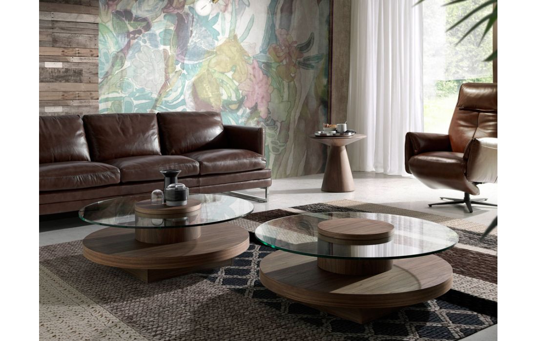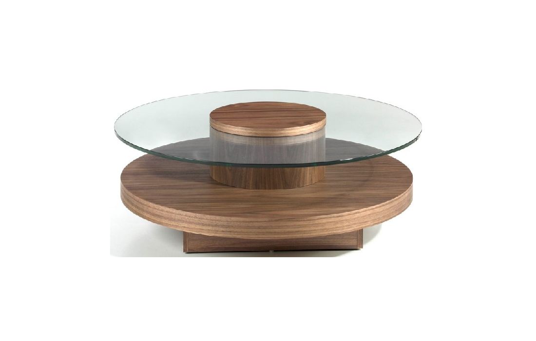 Mesa de centro redonda de madeira de freixo folheada a nogueira e tampo de vidro temperado.