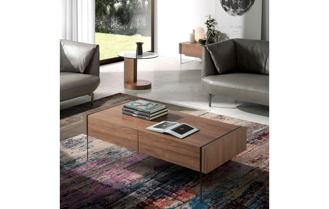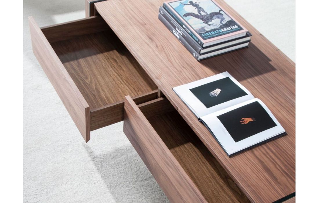 Mesa de centro retangular com design moderno, fabricada em MDF de nogueira natural e a sua estrutura de pés em vidro temperado proporciona o toque moderno e vanguardista com 2 gavetasDestinatário :