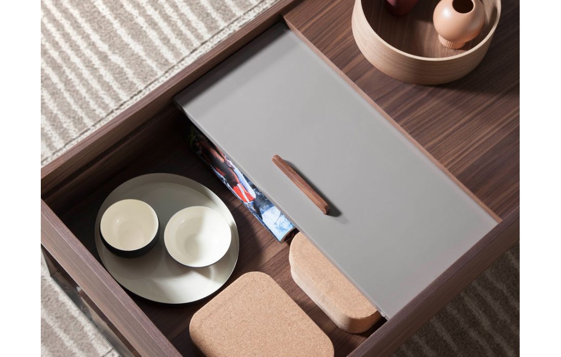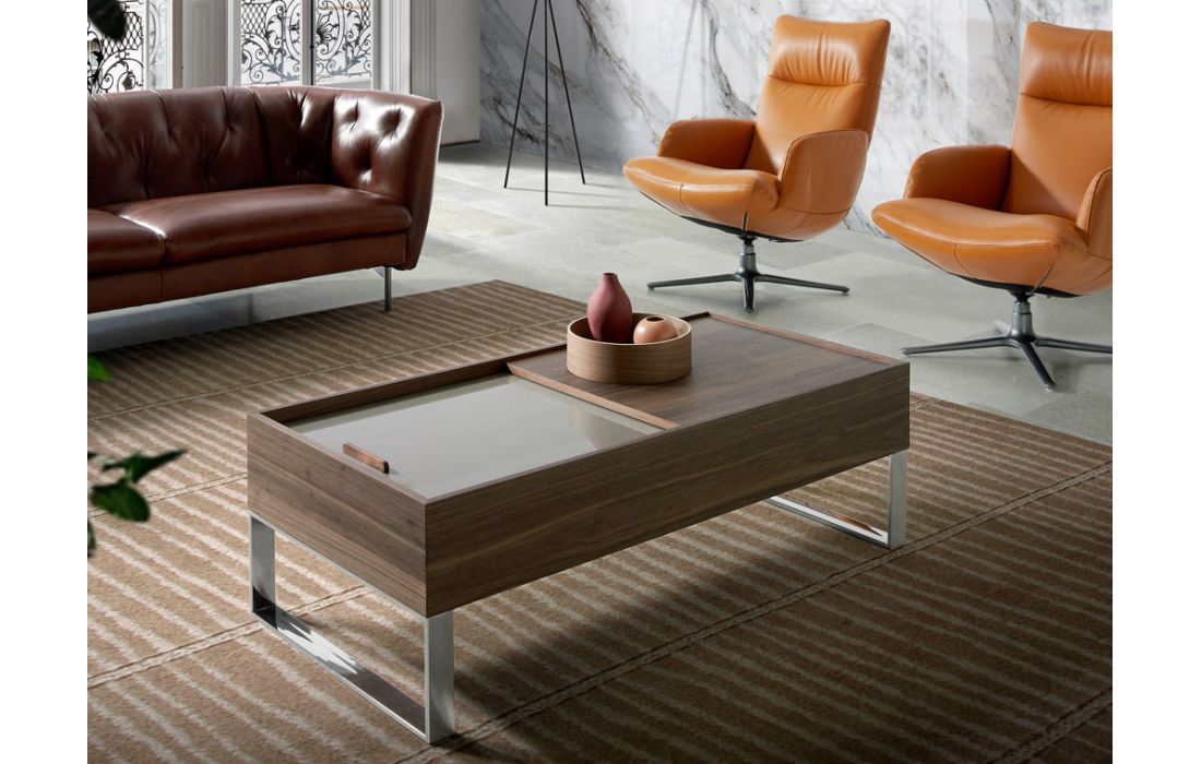 Mesa de centro com pés em aço inoxidável. Tampa superior deslizante no interior da cavidade.