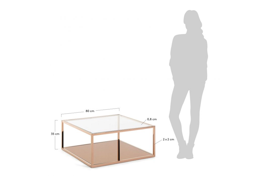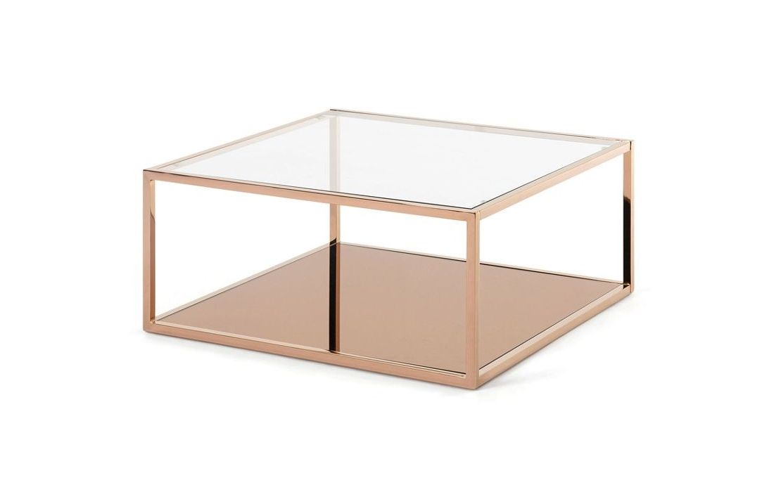 Mesa de centro retangular com estrutura de metal e tampo de baixo em vidro ambos c/ acabamento em cobre e tampo de cima com vidro transparente.Destinatário :