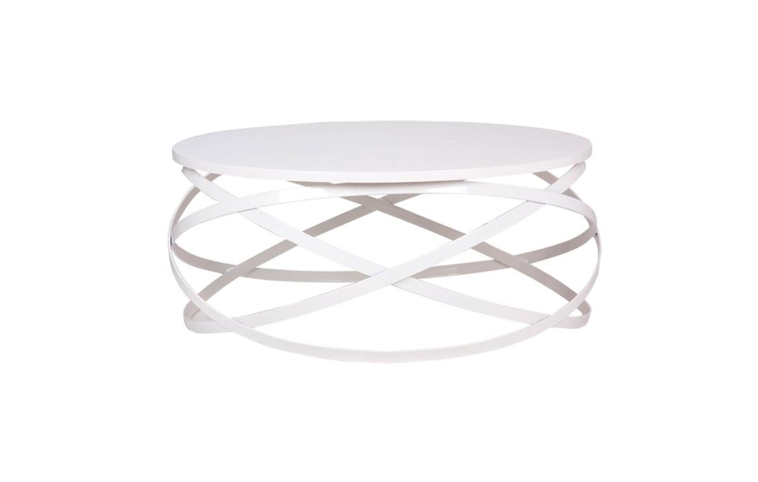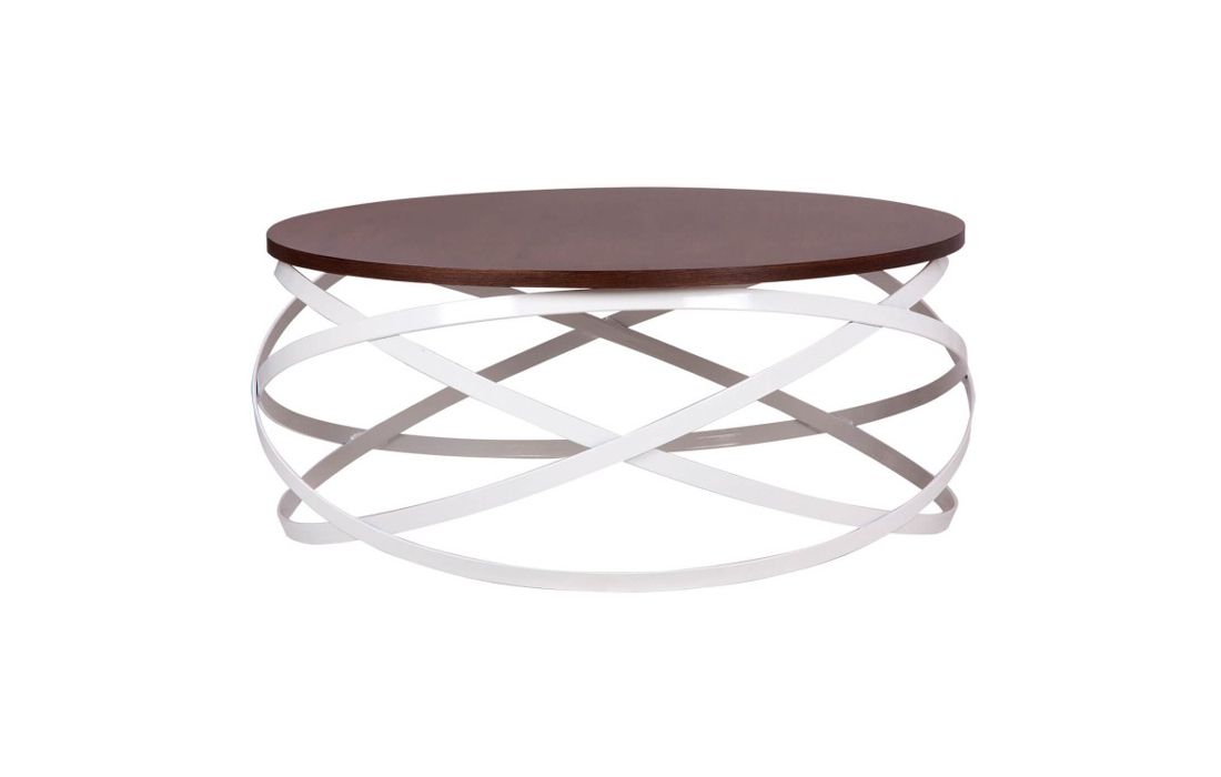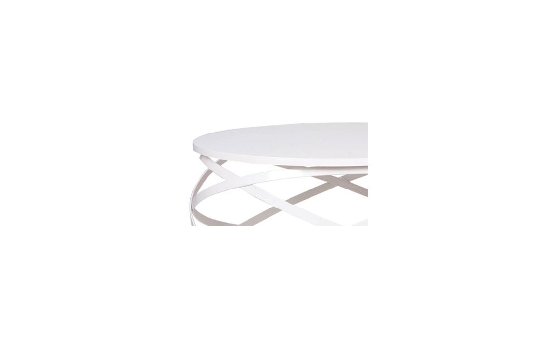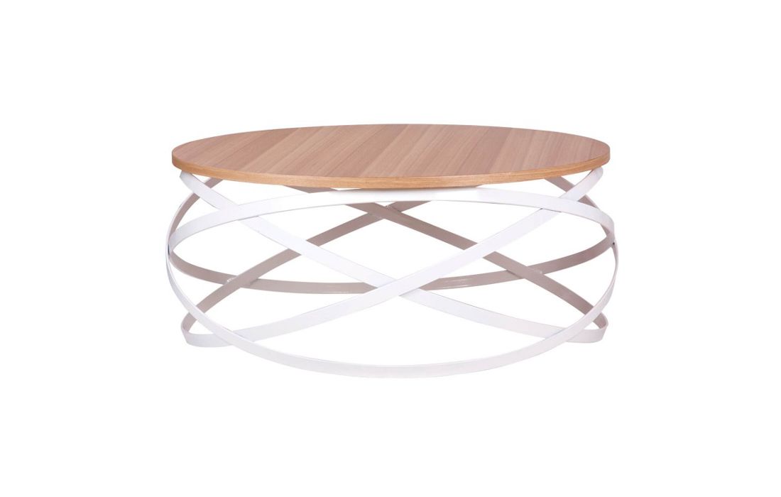 Mesa de centro com base em metal branco com 3 opções de tampo lacado branco mate, carvalho e nogueira.