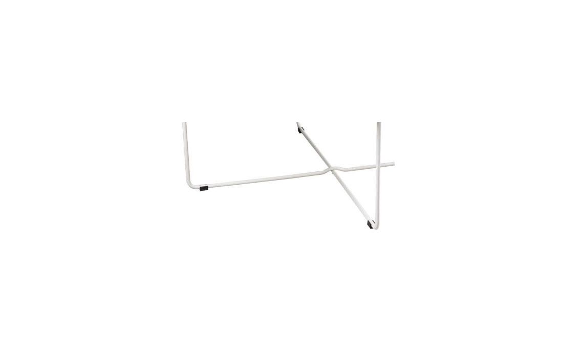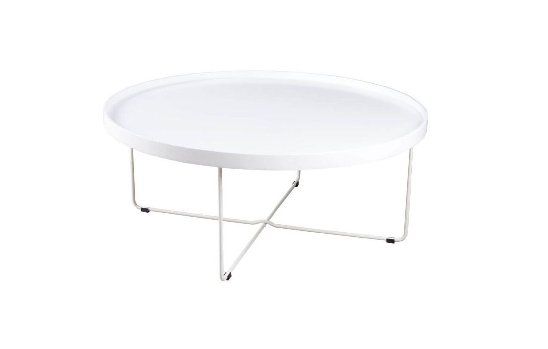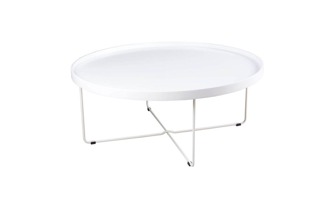 Mesa de centro redonda branca com tampo em MDF e feita com estrutura de metal branco.
