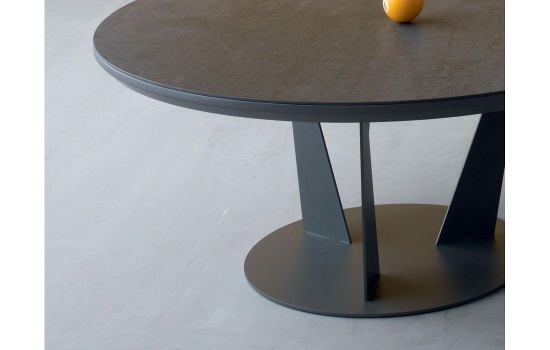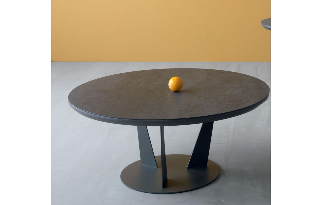 Mesa de centro com base metálica revestida em epóxi. Tampo em cerâmica.