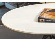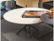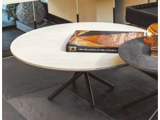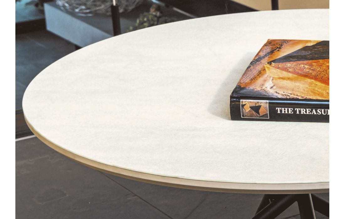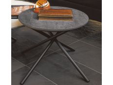 Mesa de centro com tampo cerâmico Ø 60, com base metálica cruzada revestida com epóxi.