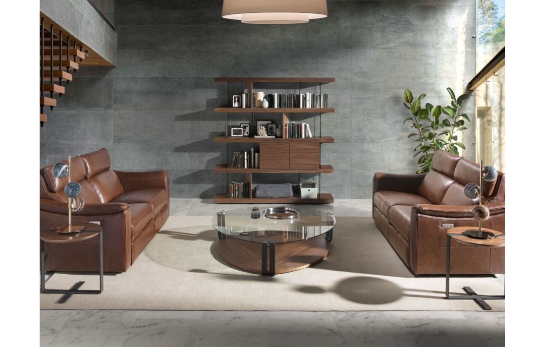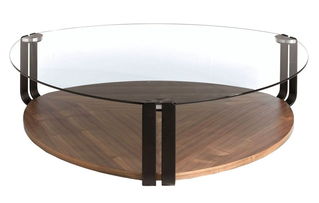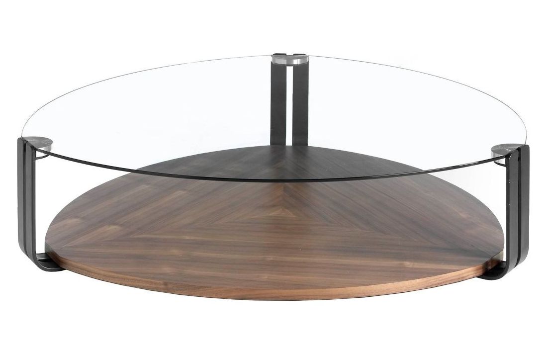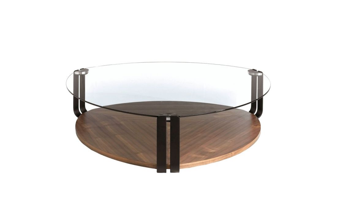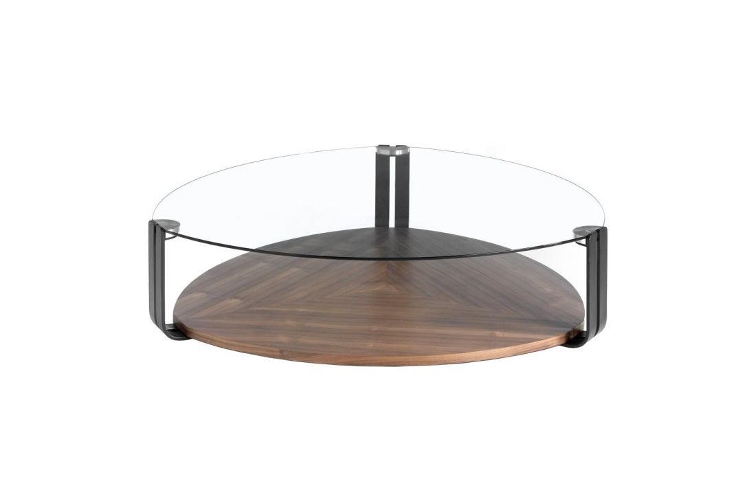 Mesa de centro de design moderno com tampo em vidro e pernas em aço inoxidável e base em folheado de nogueira naturalDestinatário :