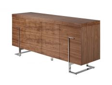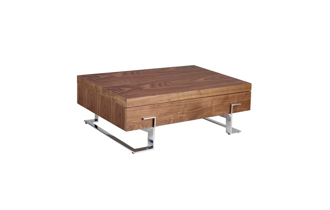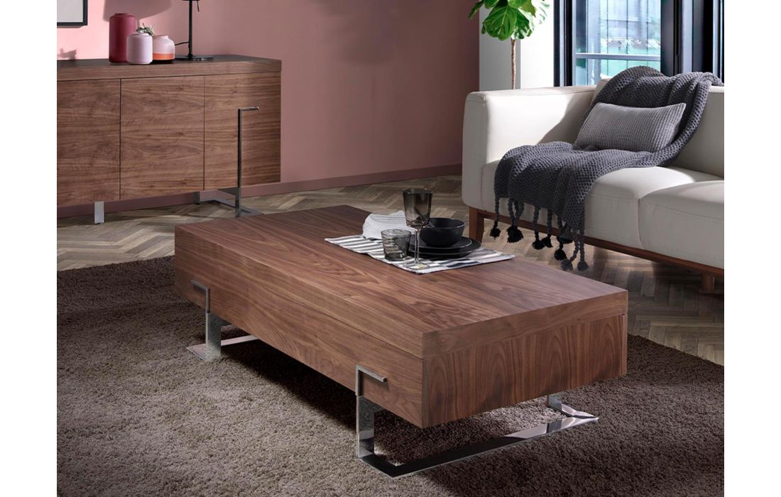Mesa de centro retangular com tampo em madeira de nogueira e pés em inox cromadoDestinatário :