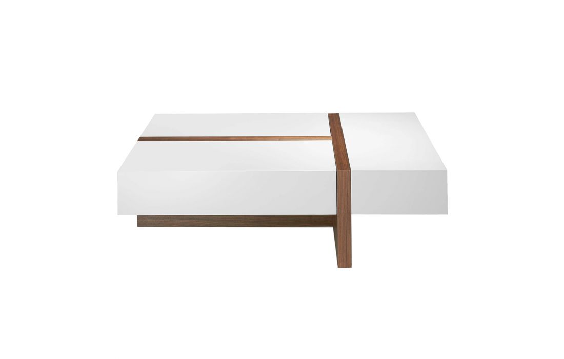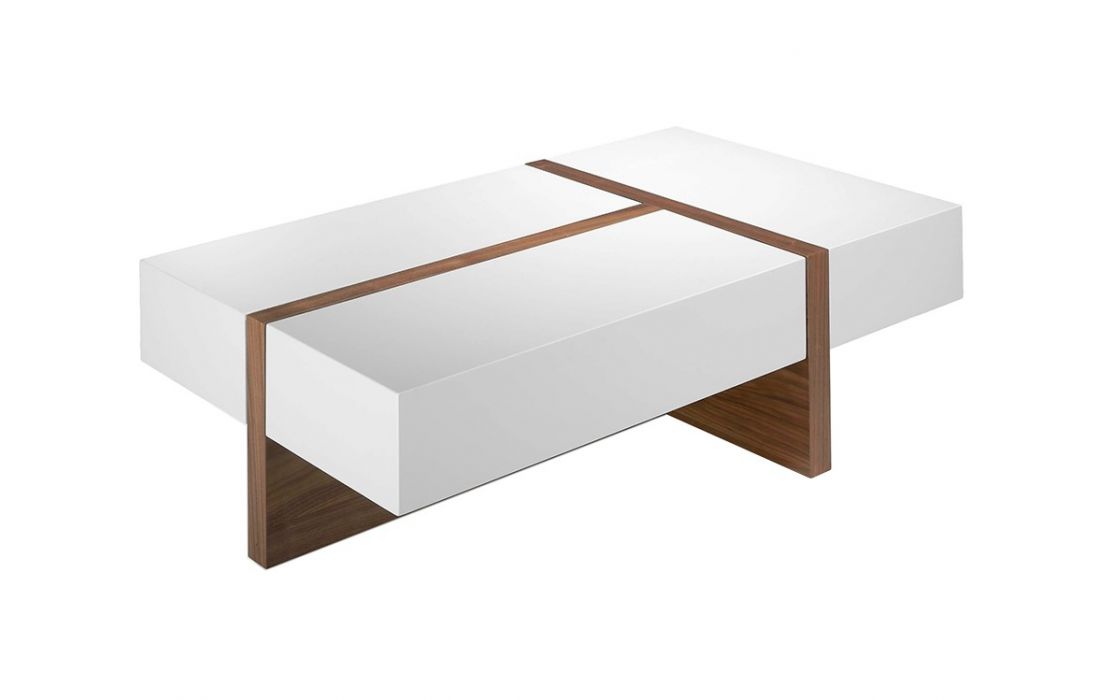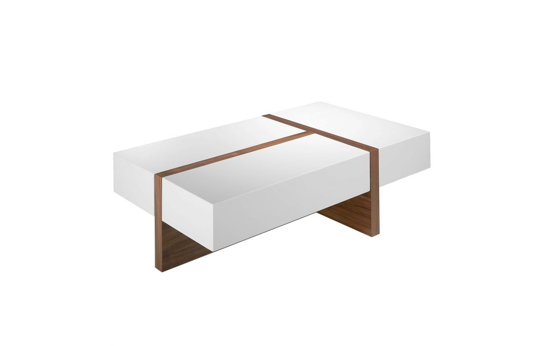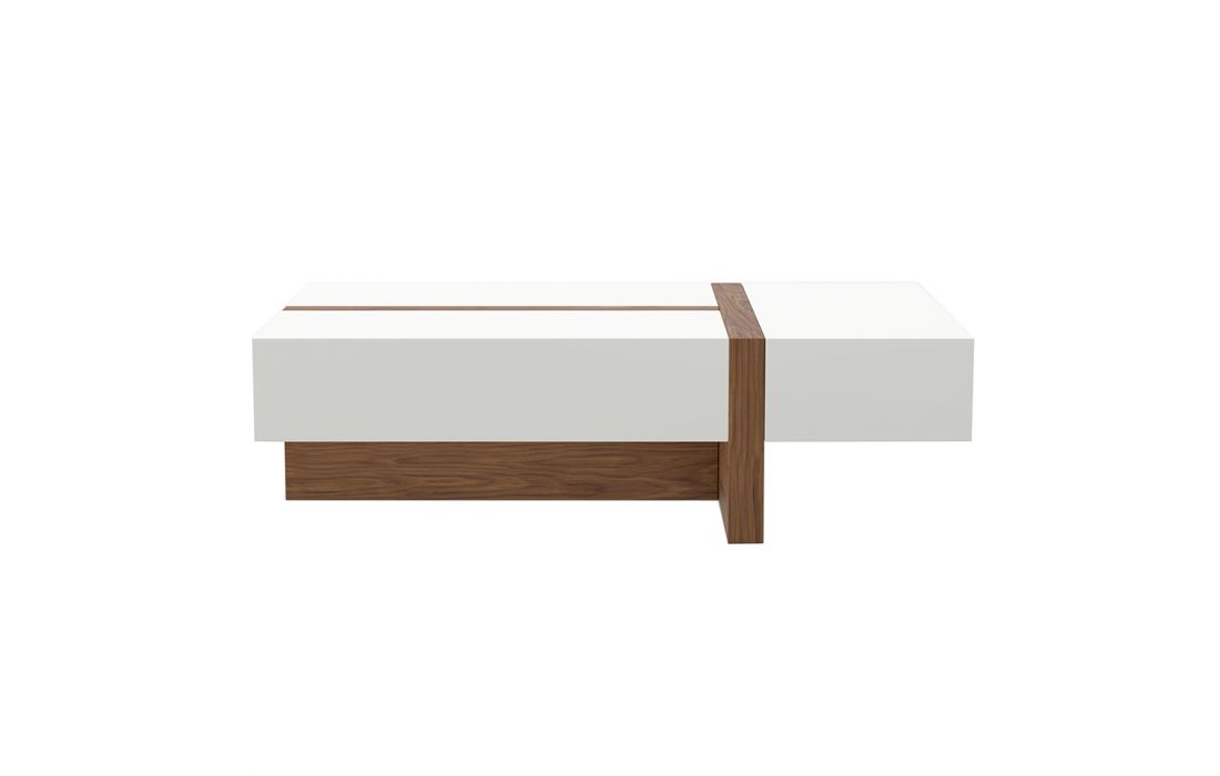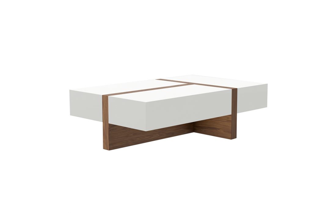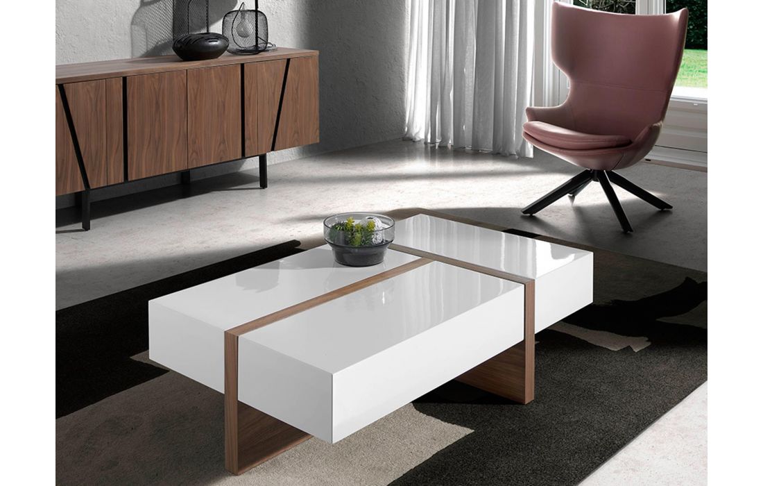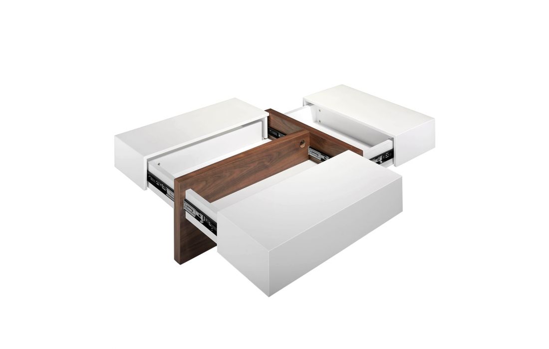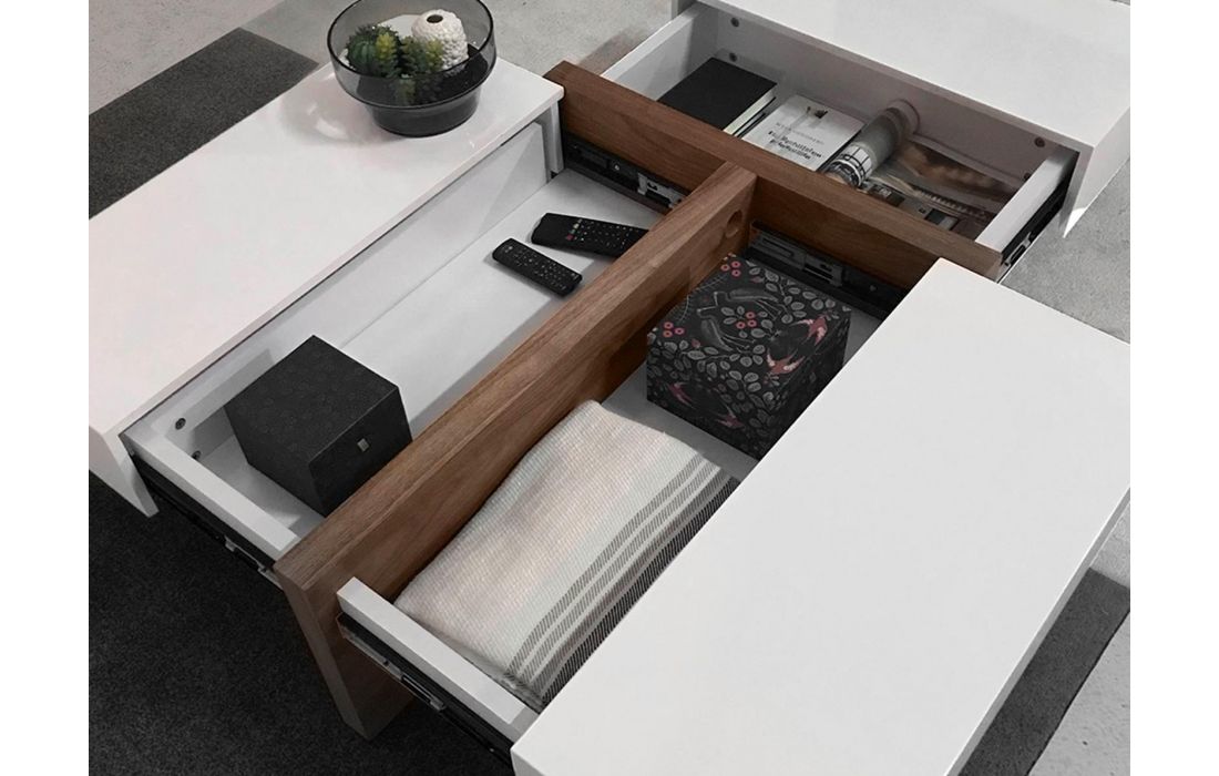 Mesa de centro com 3 gavetas deslizantes em estrutura de madeira folheada a nogueira e tampos em MDF lacado branco brilhante.Destinatário :