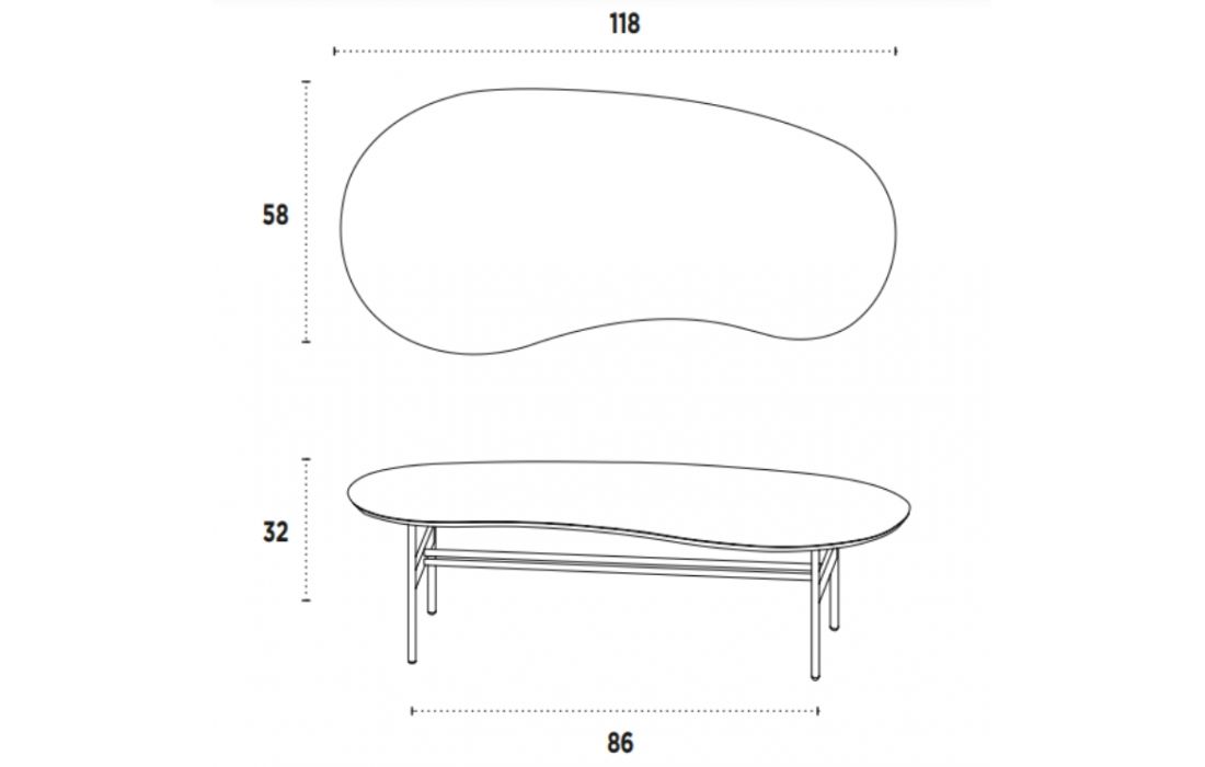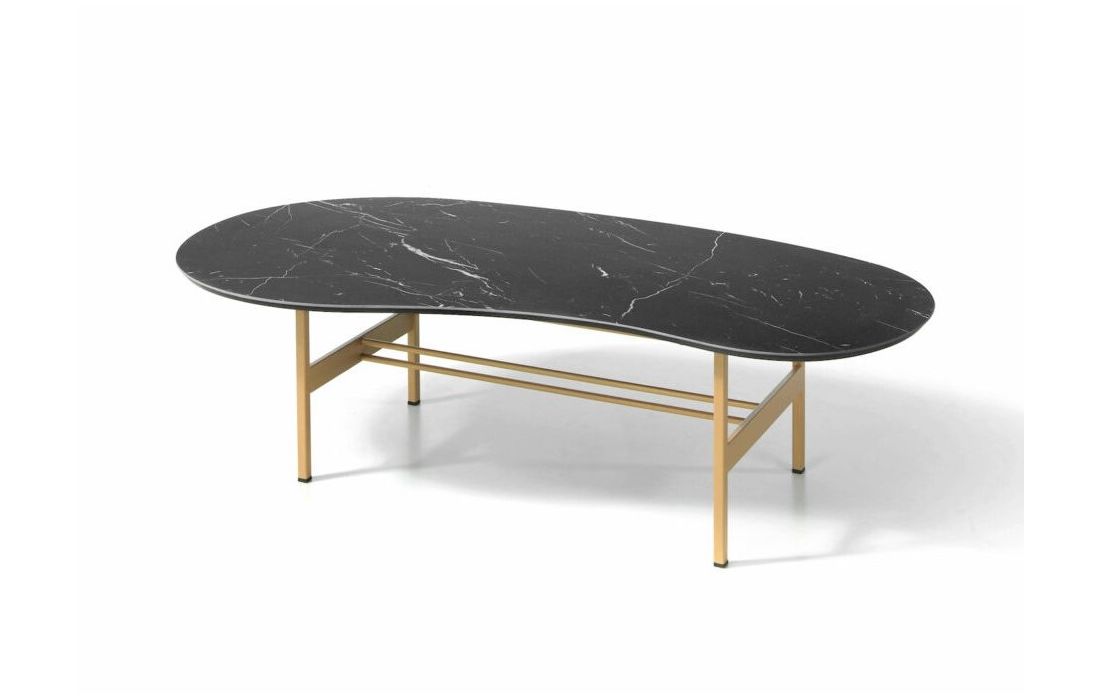 Mesa de centro com formato irregular, tampo em cerâmica e pés em metal