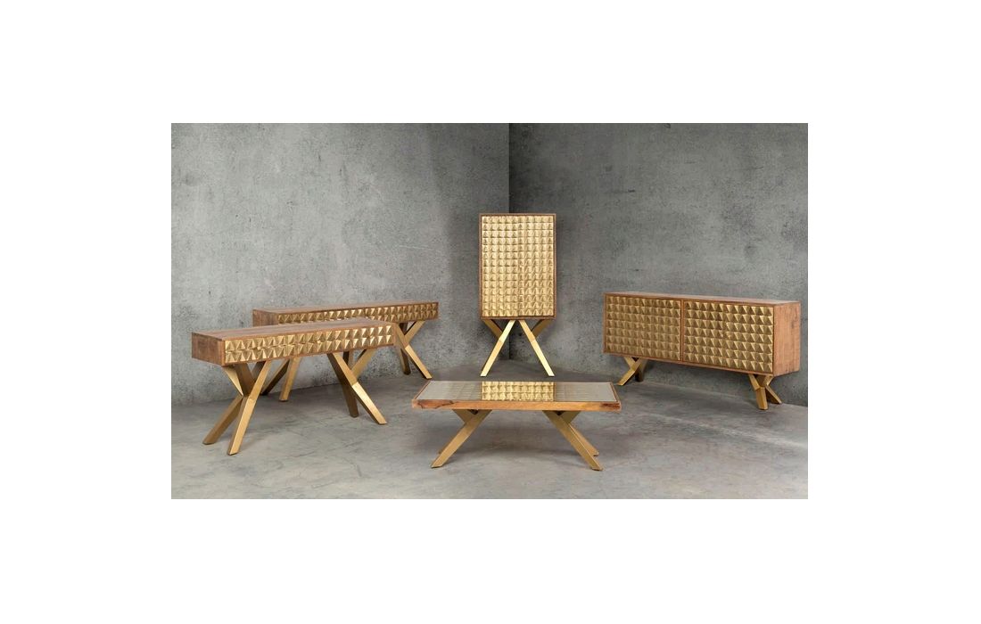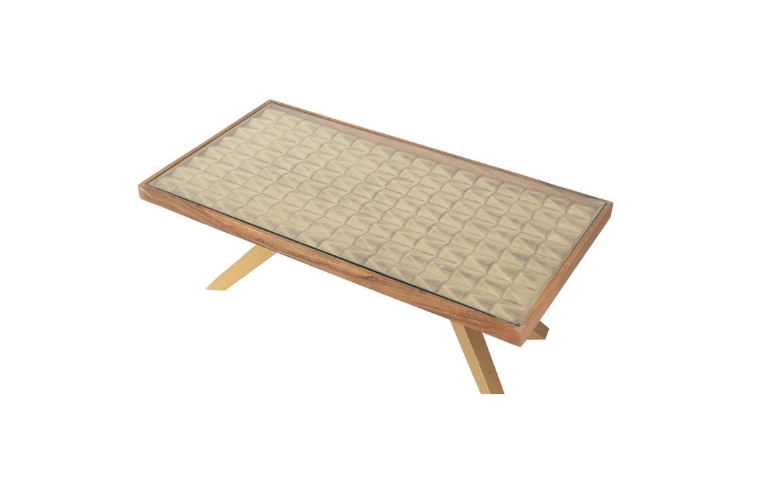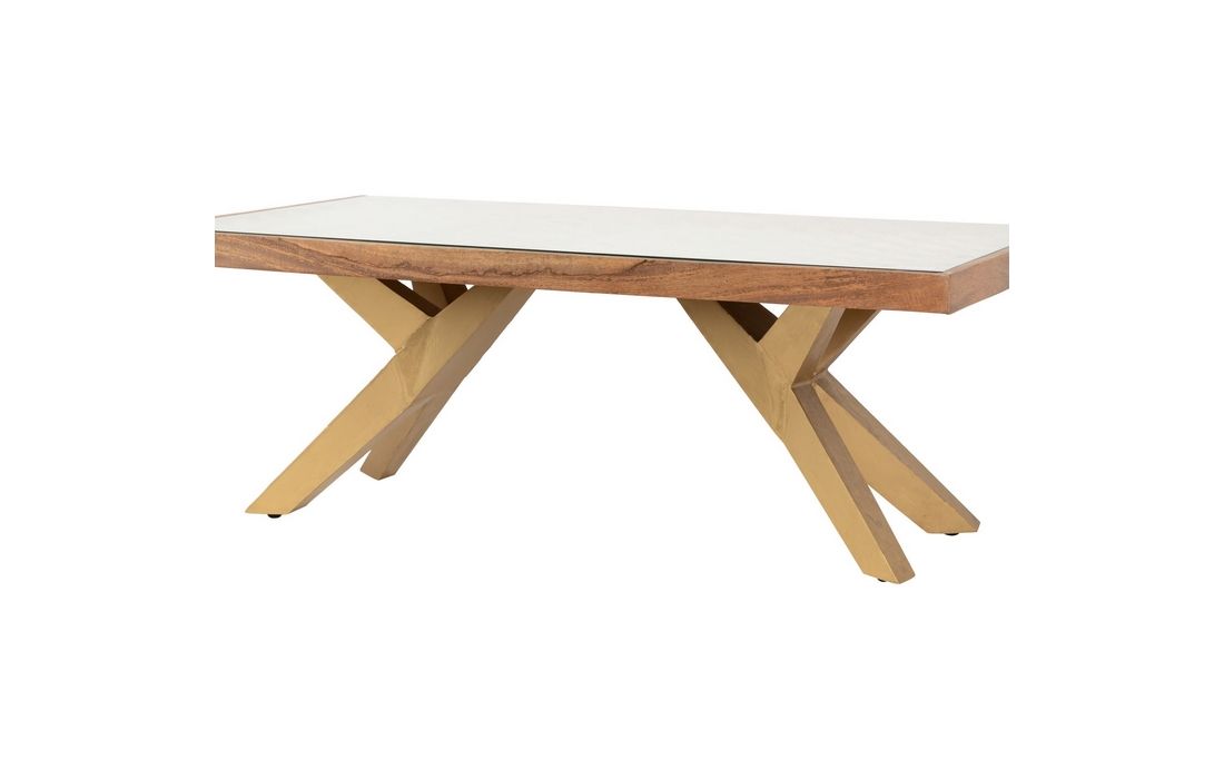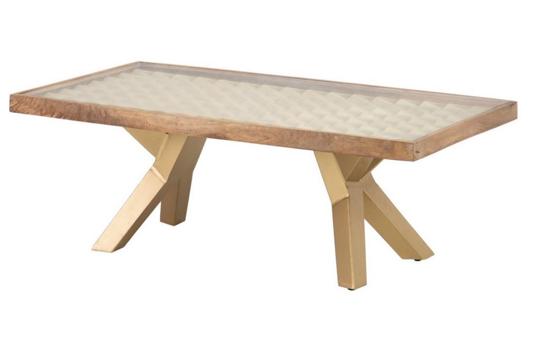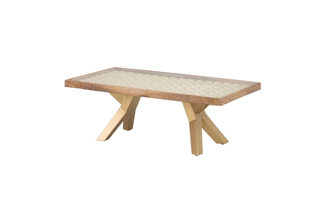Mesa de centro em madeira de mangueira com tampo em vidro e pés em metal pretoDestinatário :