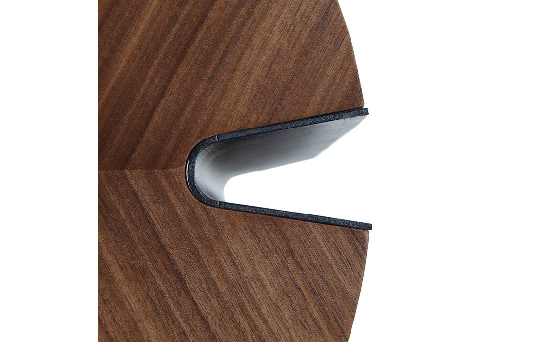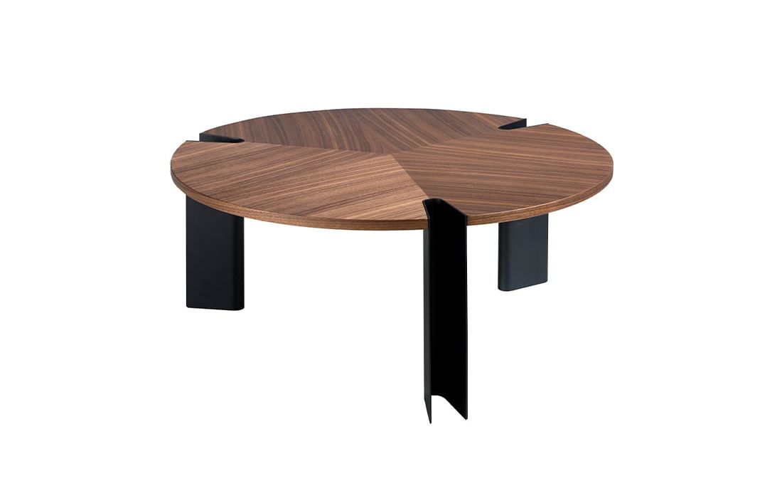 Mesa de centro redonda com tampo folheado a nogueira e estrutura dos pés em aço inoxoxidável cor pretaDestinatário :