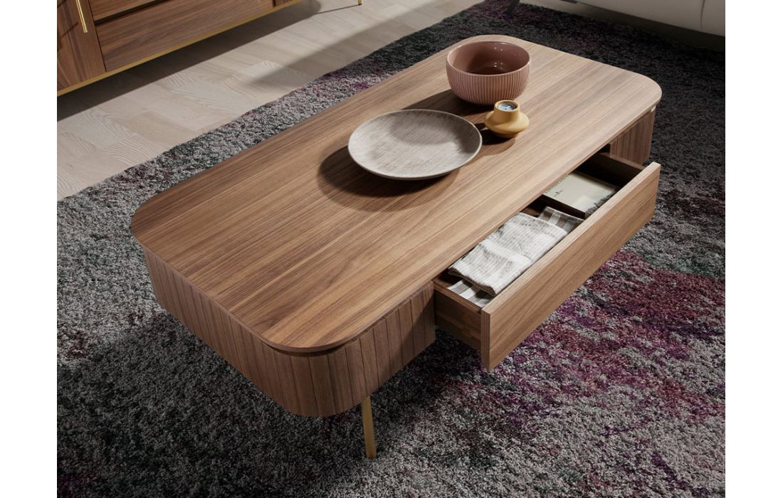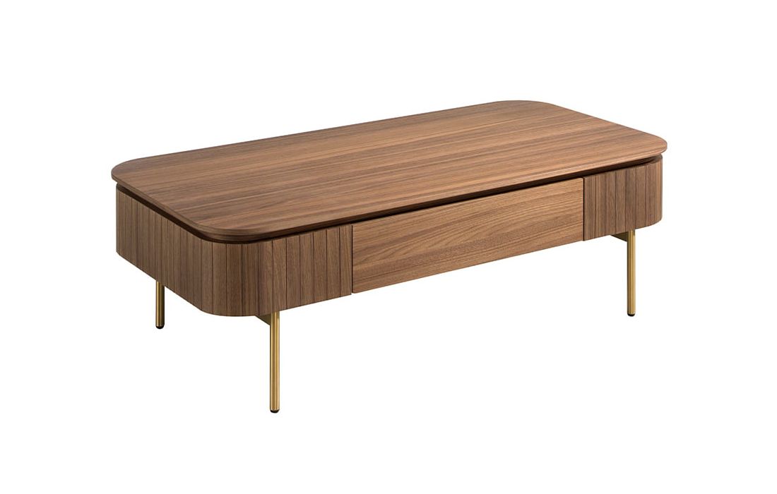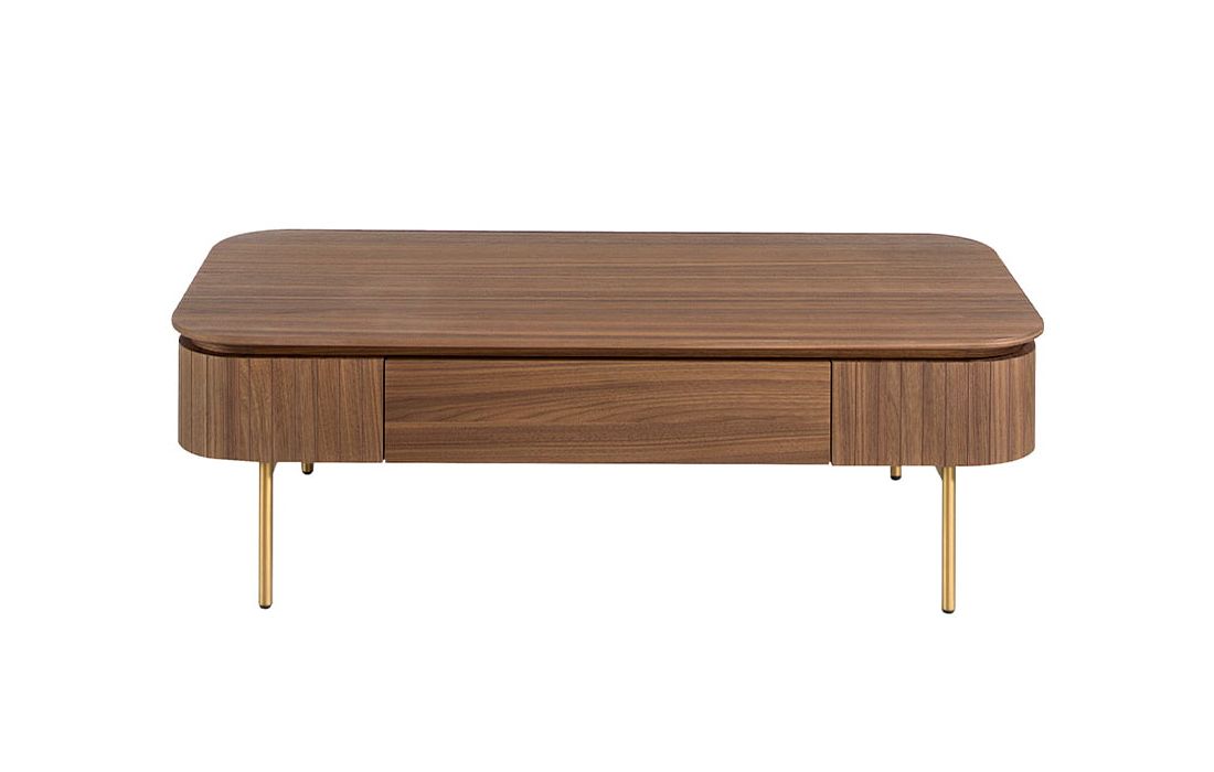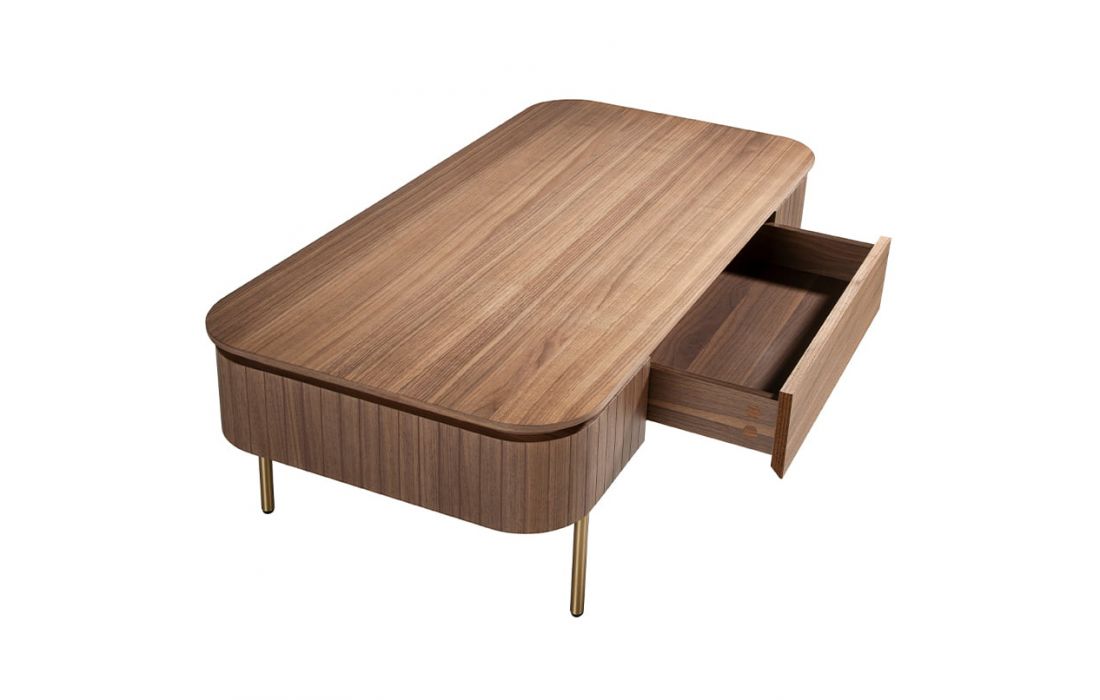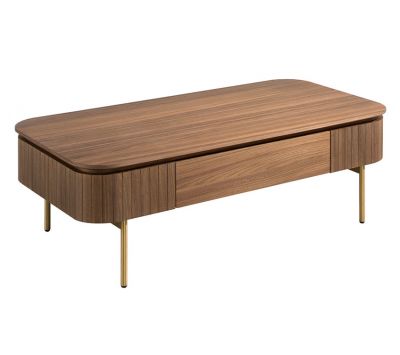 Mesa de centro com 1 gaveta retangular folheada a nogueira e estrutura dos pés em aço inoxidável douradoDestinatário :