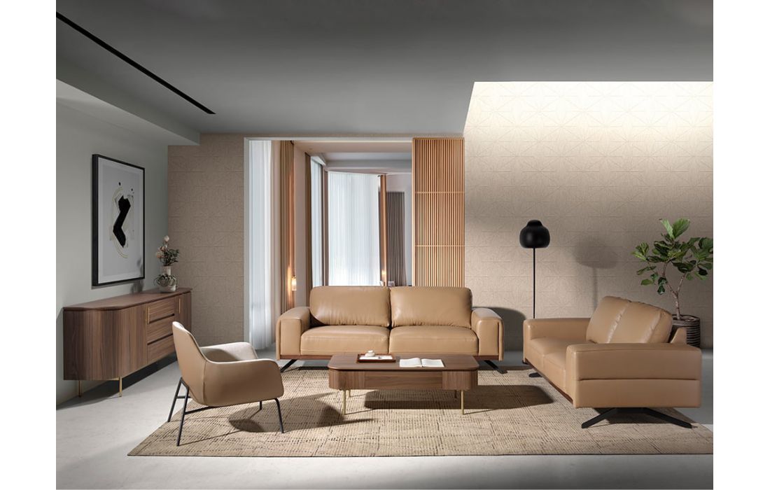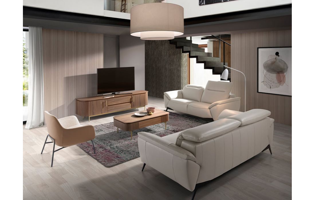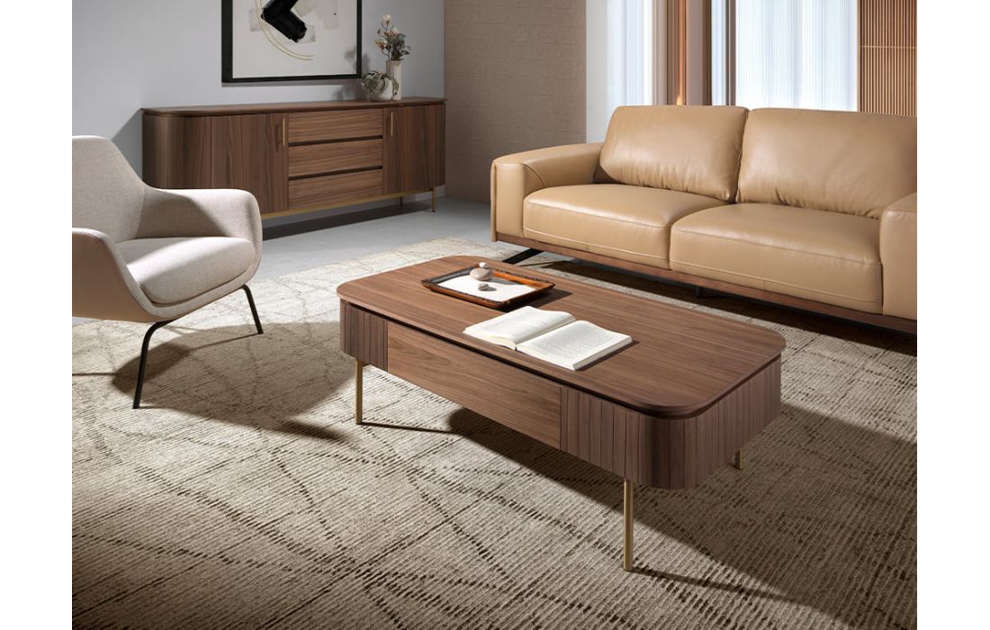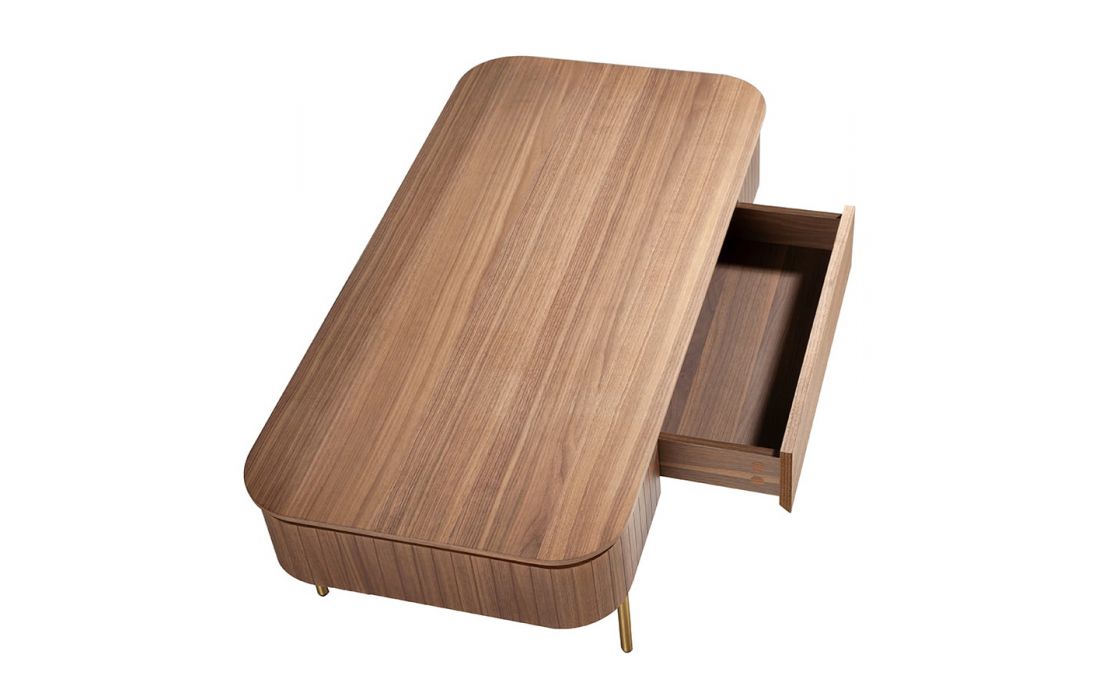 Mesa de centro com 1 gaveta retangular folheada a nogueira e estrutura dos pés em aço inoxidável douradoDestinatário :