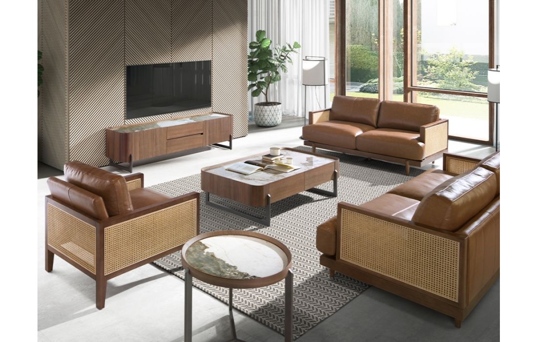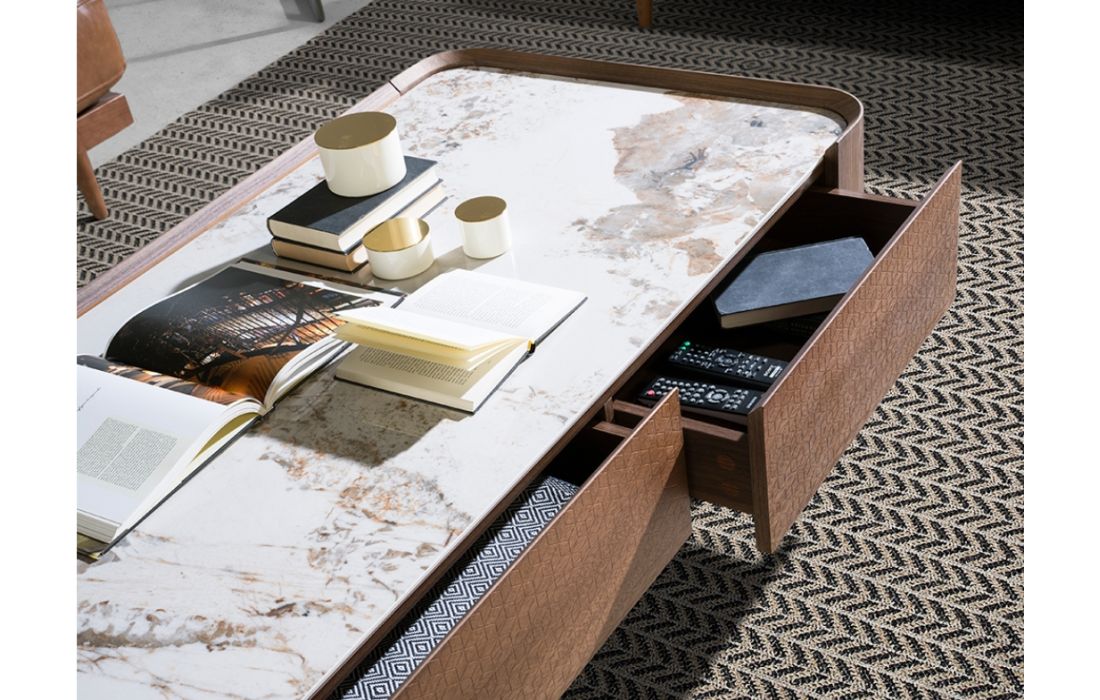 Mesa de centro retangular com design moderno, feita de MDF de nogueira natural e um elegante tampo de mármore com acabamento brilhante com pés em aço inoxidável e 2 gavetasDestinatário :